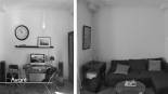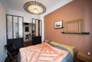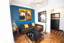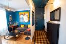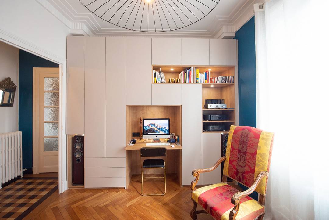 Appartement avec déjà un certain caractère, il manquait peu de chose à ce bien Lyonnais pour révéler tout son charme. L'idée ici était de mixer le cachet de l'ancien existant (mobilier, parquet, carrelage, moulures...) avec des éléments plus contemporain tout en créant une harmonie entre les différents espaces. Ainsi, l'entrée et le salon se voient arborer d'un bleu peps contrastant non seulement avec le carrelage et le parquet existant, mais aussi avec le mobilier. Une verrière apporte à la fois un nouvel atout charme à l'appartement mais aussi une luminosité naturelle à l'entrée. Pièce maîtresse du salon et élément clé de l'optimisation de l'espace, le meuble sur-mesure multifonction (penderie, bureau, enceintes...) se voit parer de couleurs douces et chaleureuses. La chambre quant à elle, reprend les tonalités du carrelage avec quelques touches de bois (chevet) afin de créer une cohérence à l'ensemble.