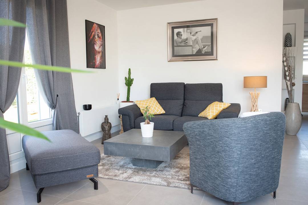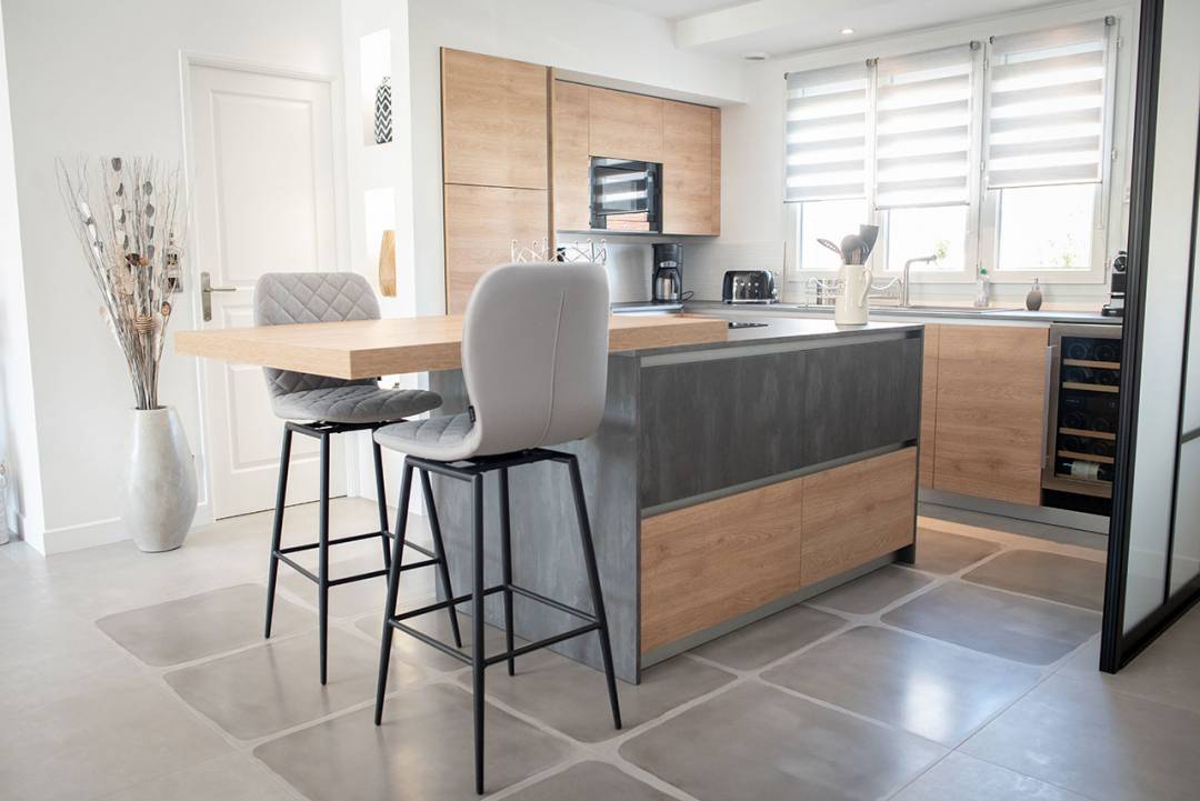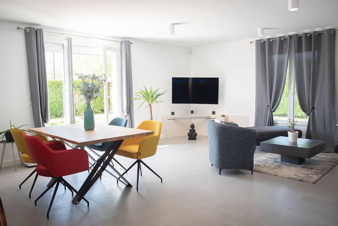 Cette maison de lotissement n'avait pas changé de look depuis plus de 10 ans. Son propriétaire en pleine réflexion sur les changements à effectuer, a préféré demander de l'aide à 1.61 design pour l'aménagement et la décoration de ses pièces de vie. L'objectif premier de ce nouvel agencement, était d'apporter plus de lumière à l'ensemble des espaces. Ainsi les cloisons séparant la cuisine du salon, tombent pour créer une nouvelle perspective dès l'entrée. La pose du même carrelage dans l'ensemble des espaces permet de les unifier et d'accentuer cet effet de perspective. Toujours dans le but de conserver une lumière traversante, une verrière toute hauteur vient délimiter l'entrée. Grâce à l'application d'un film dépoli sur sa moitiée, elle offre par la même occasion une touche d'intimité aux occupants. Le deuxième objectif de ce projet était de moderniser et d'optimiser ces nouveaux espaces. Ainsi, la cuisine fait peau neuve, arborant un style plus contemporain et chaleureux grâce aux matériaux choisis. L'îlot, pièce maitresse et coin de partage, crée le lien entre la cuisine et le salon/salle à manger. Tout en gardant la même tonalité que les espaces précédents, le salon/salle à manger est aménagé avec du mobilier contemporain aux lignes épurées. Leurs différents coloris et matièriaux tranchent avec les murs et permettent de mieux définir les différentes zones. En résumé, un nouvel intérieur optimisé résolument ancré dans l'air du temps.