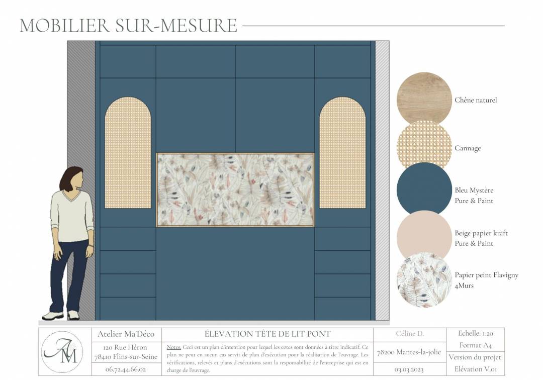 Pour un effet wahou et originale, la cliente souhaitait des plans pour concevoir une tête de lit pont pour aménager sa chambre d'amis. Elle souhaite une ambiance douce, naturelle et confortable. Le bois et le cannage vont venir réchauffer l'association du bleu et du rose.