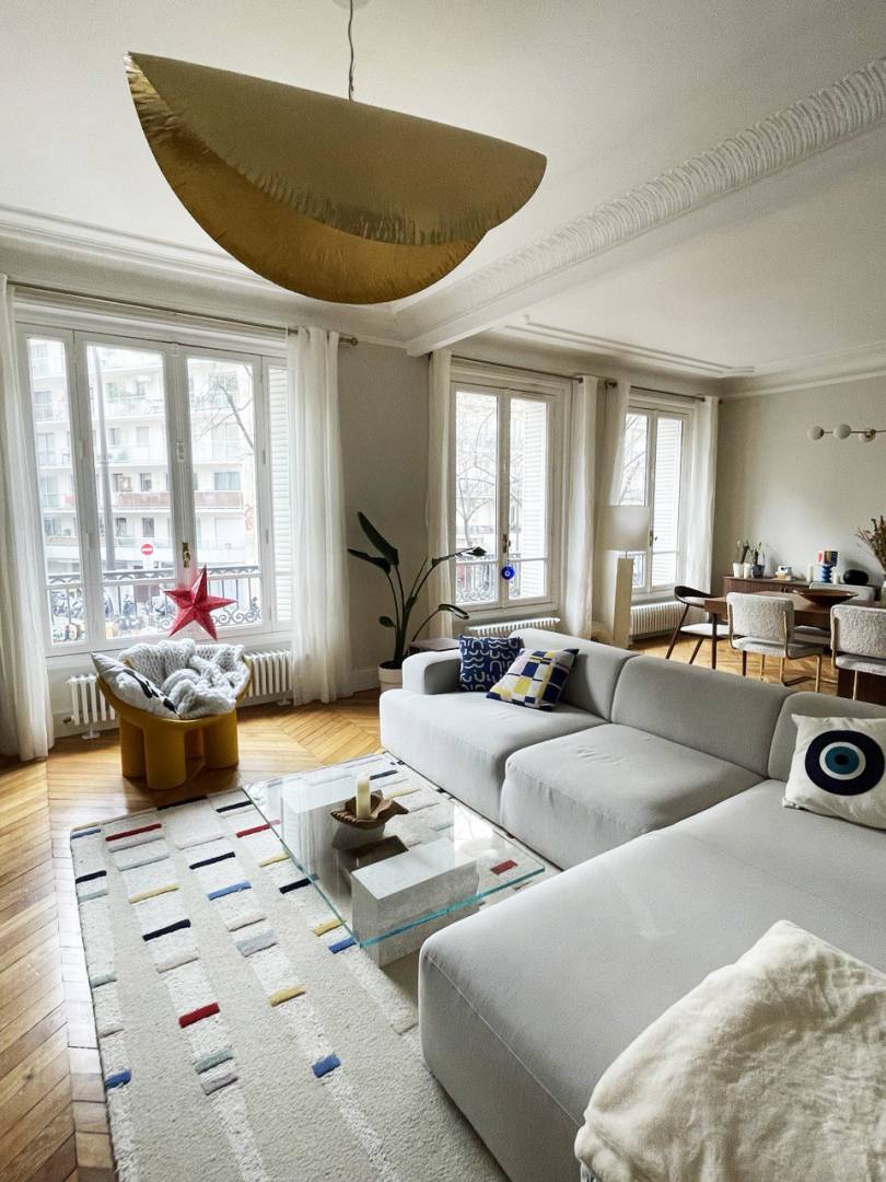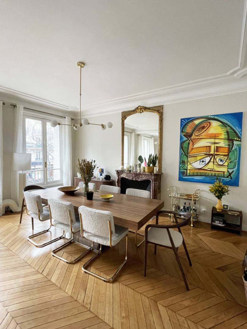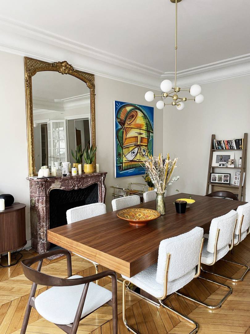 L’objectif de ce projet est de décorer entièrement un grand salon-salle à manger de 32 m². Les heureux propriétaires de cet haussmanien ont vécu de nombreuses années à Londres où ils ont fait l’acquisition d’une œuvre de l’artiste Panik. Ils souhaitent créer une décoration autour de ce salon tout en conservant l’atmosphère haussmannienne des lieux. Afin de les aider dans leur choix, je leur ai proposé un moodboard pour définir ensemble l’ambiance de la pièce. Je leur ai ensuite proposé une shopping list et des vues 3D afin de mieux visualiser l’aménagement et le mobilier de leur futur séjour.