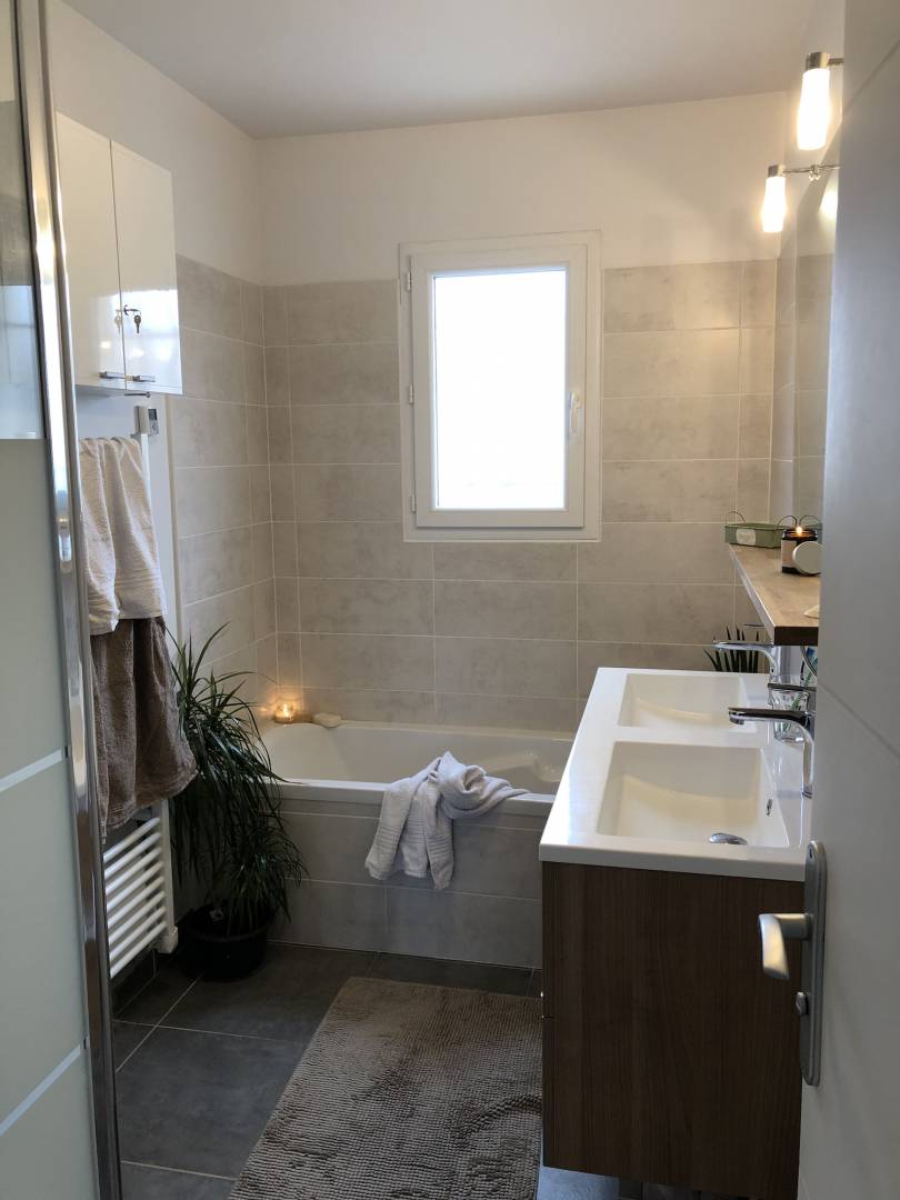 Un couple lors de la construction de leur maison a fait appel à AR’ Déco pour aménager leur salle de bain.  Ils voulaient une douche et une baignoire ainsi qu’un meuble double vasque. Il fallait intégrer tous ces éléments dans l’espace et donner une ambiance douce, relaxante et ergonomique au lieu.