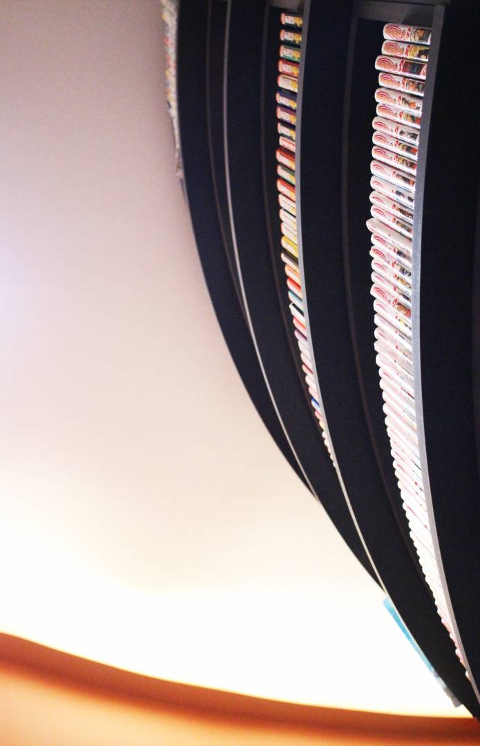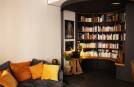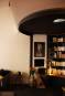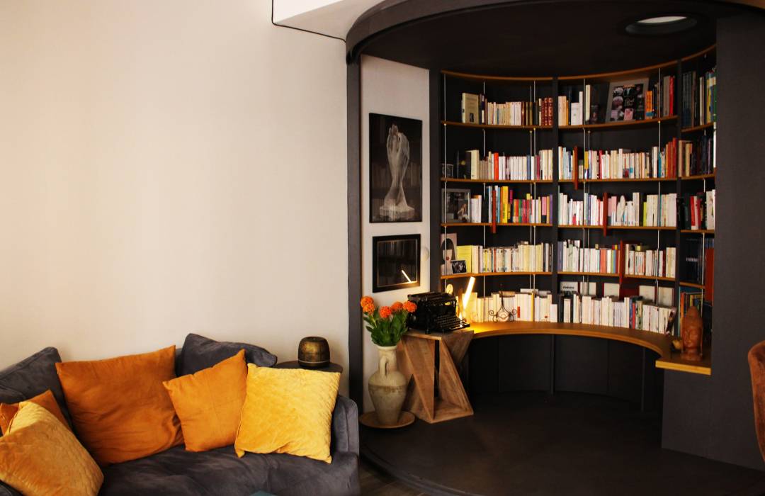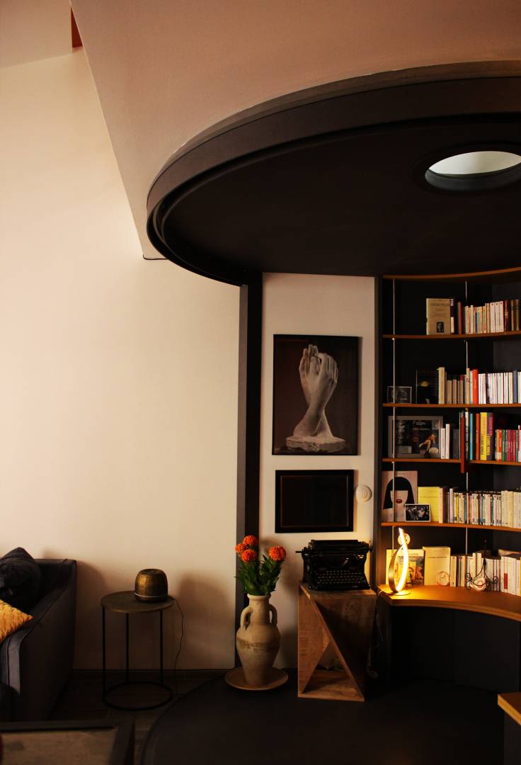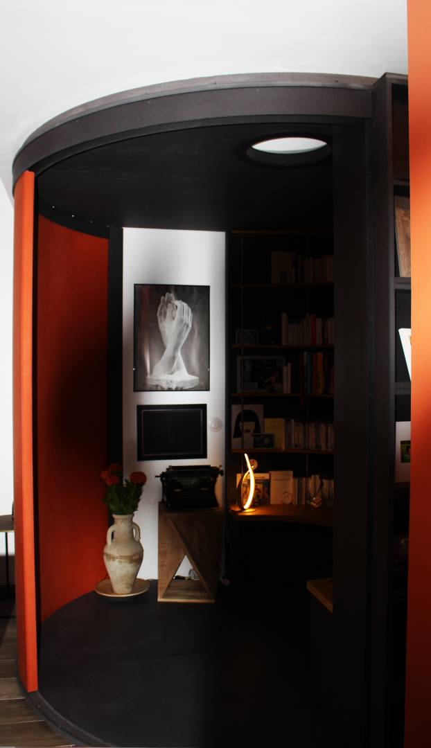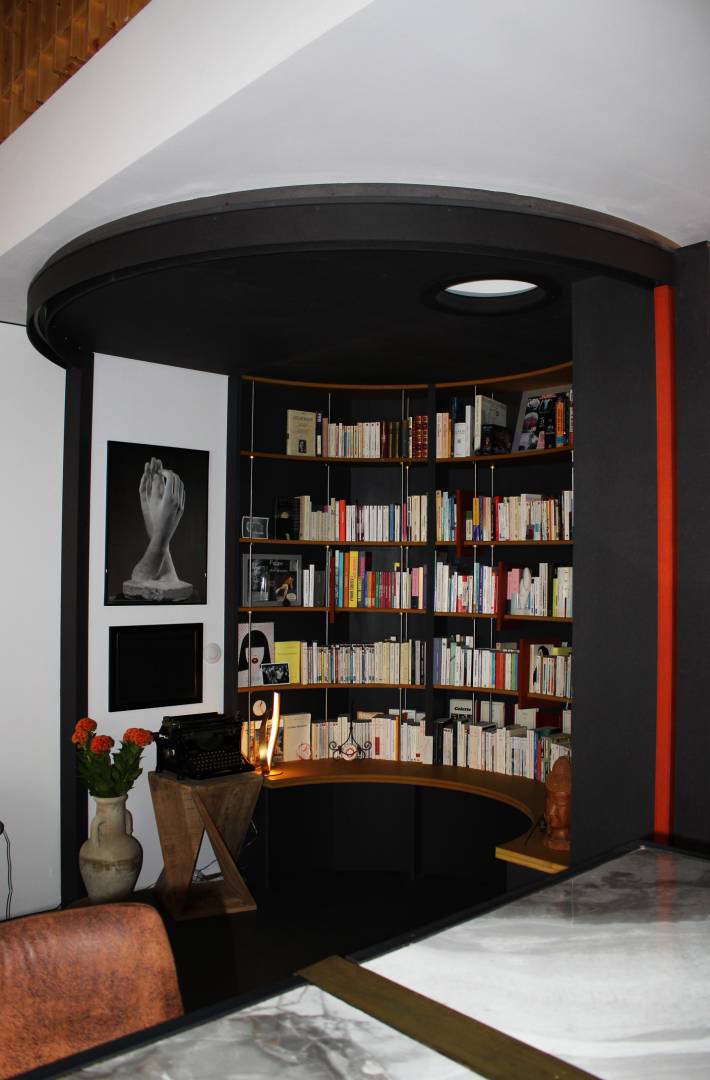 Circulaire, douce et enveloppante, elle se dévoile peu à peu laissant place au confort et au réconfort. Elle porte en elle à la fois la légèreté & le poids du savoir et des connaissances. Son touché émeut et sa lumière apaise, diffusant ainsi une atmosphère rêvée. On tourne autour, on la longe et on découvre comment elle a été imaginée sur ces deux faces. Son yin et son yang s’opposent et se complètent. Des portes courbes viennent l’habiller en coulissant entre son intérieur et son extérieur permettent ainsi de choisir entre la couper totalement du reste ou -assis sur son banc-, apprécier son ouverture face aux espaces adjacents. En panneaux Valchromat teintés dans la masse, réalisée en un seul matériau, de teintes différentes, on en a choisi 3 qui dialoguent entre elles faisant aussi écho à la peinture choisie pour les murs courbes de l’appartement dans lequel elle a trouvé refuge. Cette bibliothèque/espace a joué un rôle clé dans l’aménagement de tout cet appartement « en double peau » car son emplacement était stratégique. Partant du puit de lumière intérieur défini par un géobiologue, elle s’est développée autour orientant ma conception spatiale vers une forme souple et organique. A contrario, je la voulais non statique, mobile et changeante et c’est grâce à ces câbles tendus à la verticale que ces étagères peuvent varier et s’arrêter à la position souhaitée à l’aide d’un verrou. Cette bibliothèque, n’est tout simplement pas comme les autres, puisqu’elle est spécialement crée sur mesure pour ce lieu et elle découle d’une demande particulière des clients liée à leur volonté d’y passer le plus de temps possible et de l’importance des livres dans leur vie.
