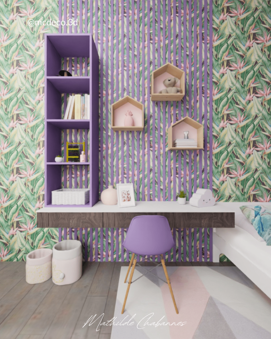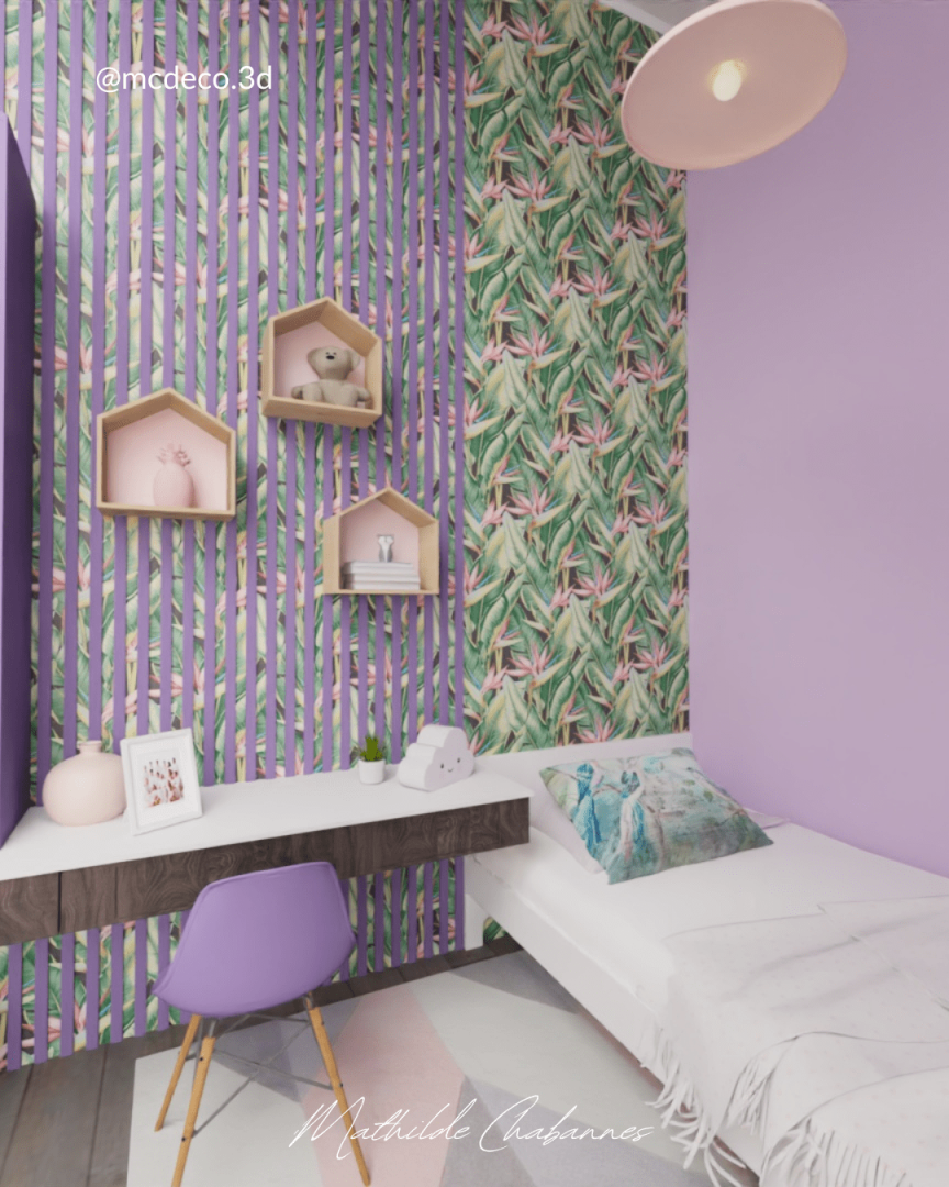 Projet MAYA : - Réalisation des plans 3D/2D et planche d'ambiance. - Chambre d'une ado qui adore le violet !