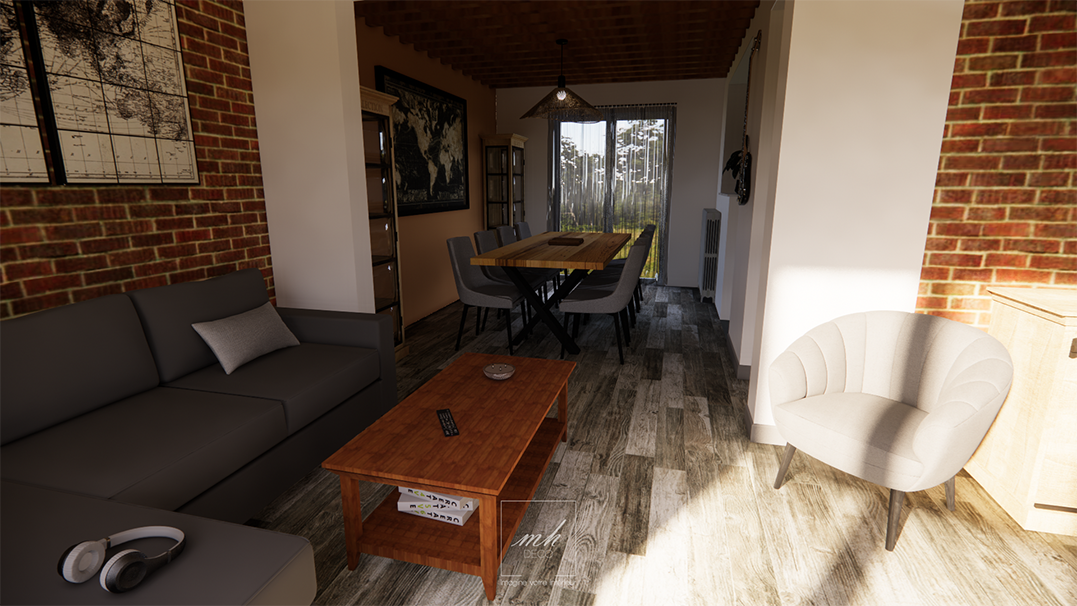 Depuis l’achat de sa maison, le propriétaire s’était contenté de mettre « un coup de blanc » aux murs et au plafond. Le temps du changement étant arrivé, il a fait appel à mes services d'architecte d’intérieur, avec une problématique : comment optimiser l’espace ? Ma réflexion s’est articulée autour de trois axes : - Redéfinir les espaces à l’intérieur de ce séjour en L. La table basse du salon gênait l’accès à la salle à manger. Qui plus est, il était impossible de circuler autour de la grande table une fois les invités assis. Le salon a donc été déplacé dans l’angle du L pour faciliter la circulation. Pour sa part, le buffet a pris la place de l’ancien grand canapé d’angle afin d’offrir l’espace qui manquait autour de la table à manger. - Imaginer une décoration qui plaise au propriétaire, à savoir : une ambiance masculine, confortable, simple, sans trop de couleur, ni trop de modernité. C’est ainsi que j'ai opté pour un style industriel. Un carrelage imitation parquet grisé a remplacé les petites tomettes trop abimées, certains meubles ont été remplacés et une partie des boiseries a été repeinte en noir. Le papier peint imitation briques rouges parachève subtilement cette composition. - Choisir un mobilier adapté à ce nouvel agencement et à cette nouvelle ambiance, tout en permettant l’accueil d’une dizaine de convives.