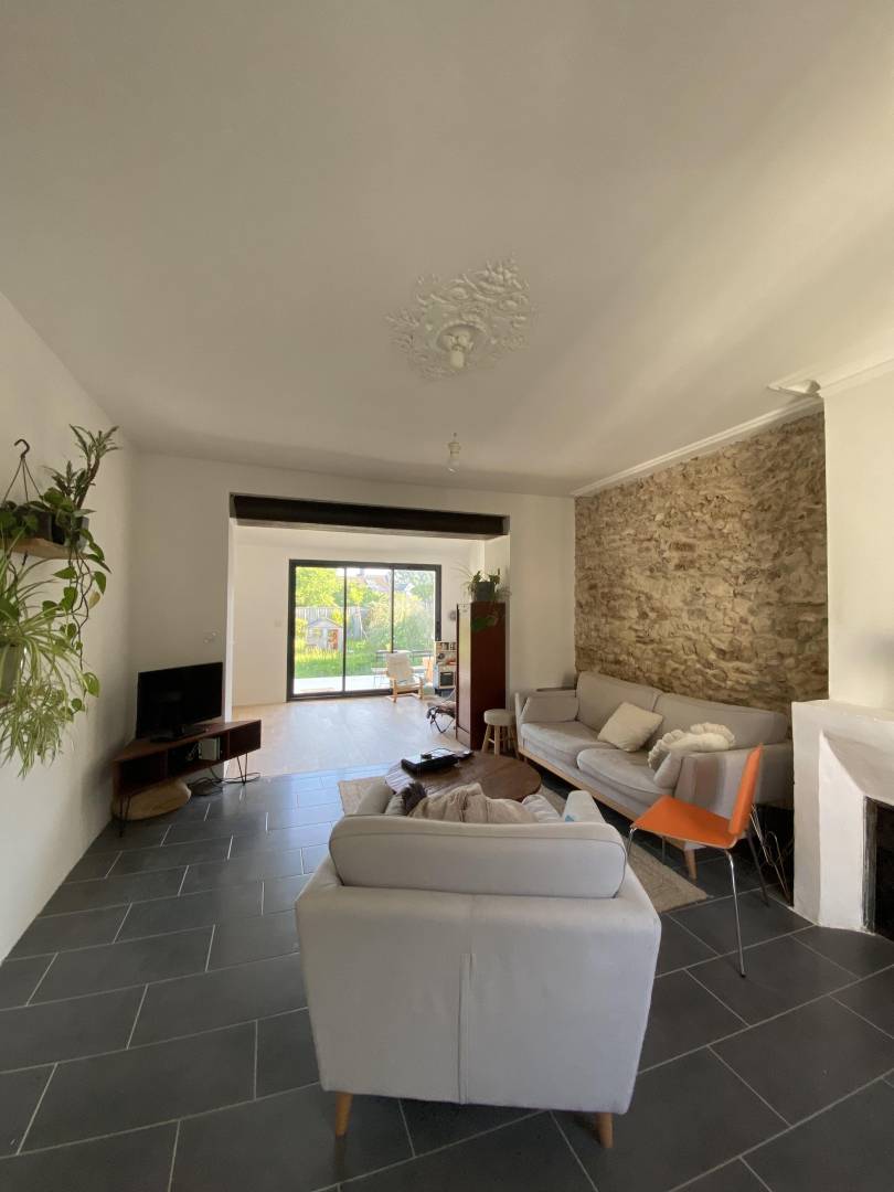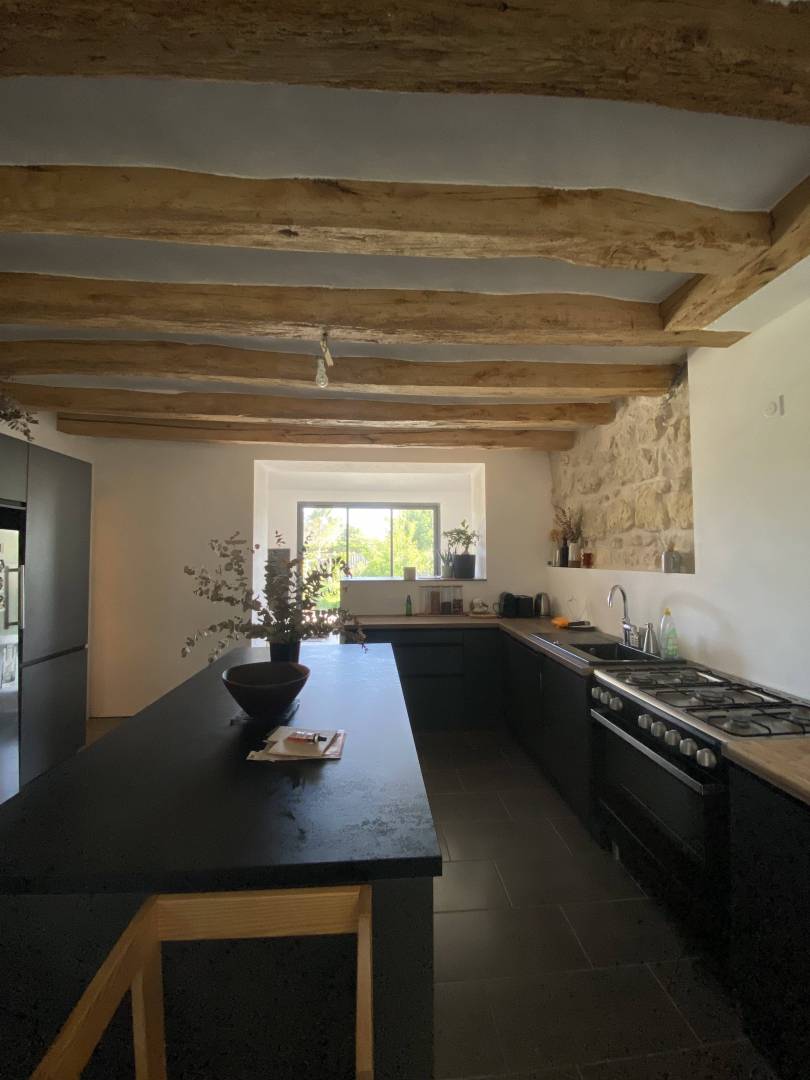 Cette longère a été complétement rénovée en façade Sud, qui correspond à la façade jardin ainsi que son garage en habitation. La maison avait la façade côté jardin complétement aveugle et était une pièce qui servait de buanderie à -80cm du niveau des autres pièces de vie. L'objectif a été de surélever cette pièce et de l'ouvrir sur le jardin, créant un traversant et une pièce de vie en plus. La maison a radicalement changé de visage.