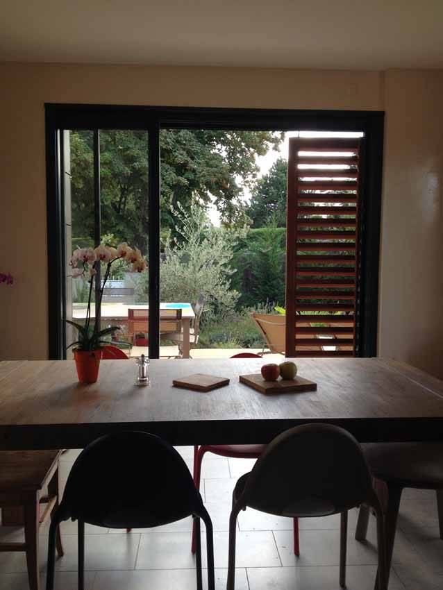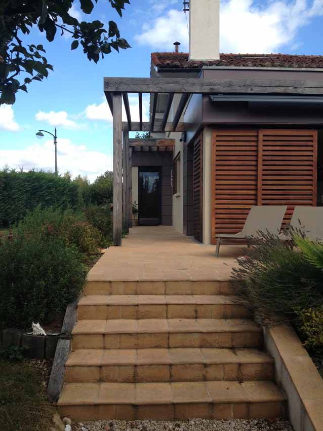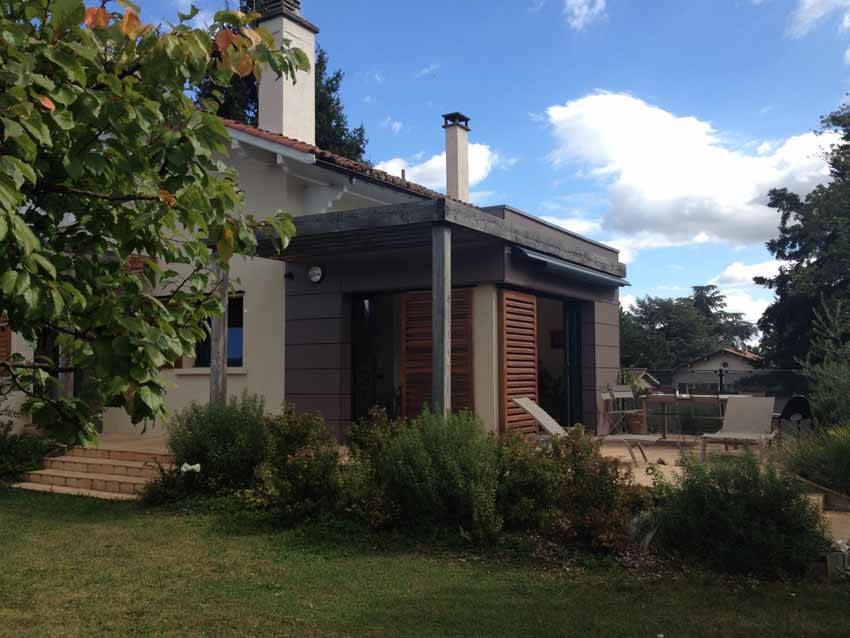 "Quand la famille s'agrandit"… Les maitres d’ouvrage ont trois enfants. La cuisine est devenue trop petite pour y manger, le soleil ne pénètre pas dans la maison qui tourne le dos au Sud et le jardin est difficilement accessible. Le projet propose donc deux extensions bois, permettant de retourner les fonctions de la maison afin de les orienter au sud. Le tout est posé sur une terrasse offrant un espace de vie extérieur de plein-pied. Une salle à manger est créée dans le prolongement de la cuisine, entièrement refaite pour l’occasion. Baignée de lumière, ouverte sur la terrasse, à l’abri d’une pergola, c’est la nouvelle pièce à vivre de la maison. La deuxième extension offre une entrée fonctionnelle pour cette famille nombreuse (SAS, placard, banc …etc). Les extensions sont en ossature bois et siporex, isolées par l’extérieur en fibre de bois. Les baies vitrées sont à galandage. Un grand soin a été pris pour choisir des matériaux rappelant les teintes du beaujolais (terre cuite au sol, composite prune au mur, enduit ton pierre…etc), pour ce projet situé dans un secteur sauvegardé.