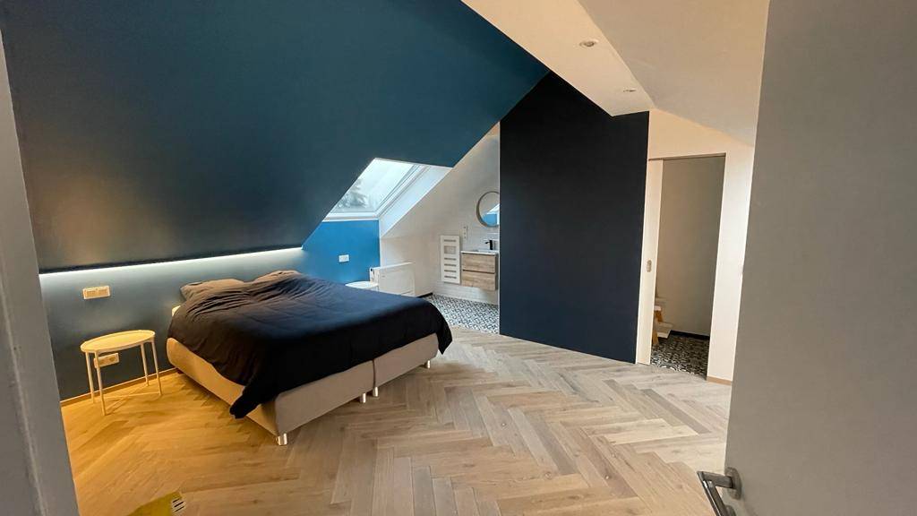 Combles aménagés en suite parentale, coin toilettes et douche séparée, les clients souhaitaient garder leur lit mais séparer les toilettes était une priorité pour eux.