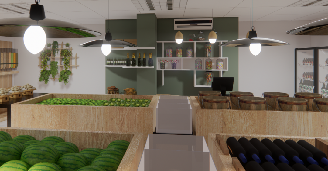Ma mission : aménager un futur magasin avec une double activité, primeur et alimentation, le propriétaire me demande de dessiner du mobilier par rapport à son besoin et de vérifier la bonne circulation tout autour des présentoirs, étalages et frigo. Le sol et peinture existants seront conservés, il y aura peut-être un peu de peinture sur un mur si le client accepte ma proposition.