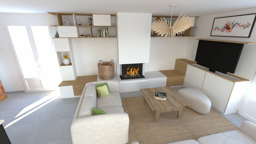 But du projet, repenser l’espace de vie du séjour autour de la table basse et de la cheminée, tout en dissimulant la télévision.