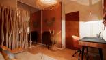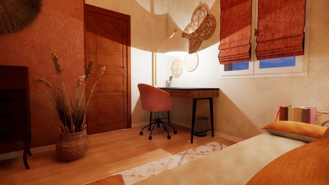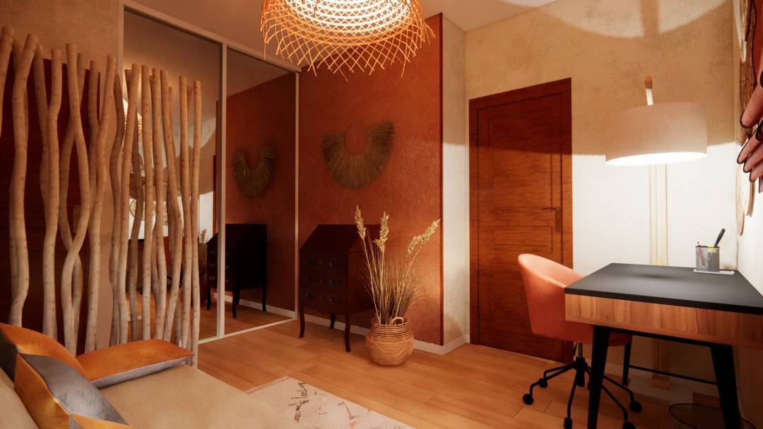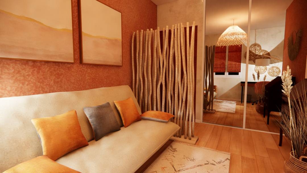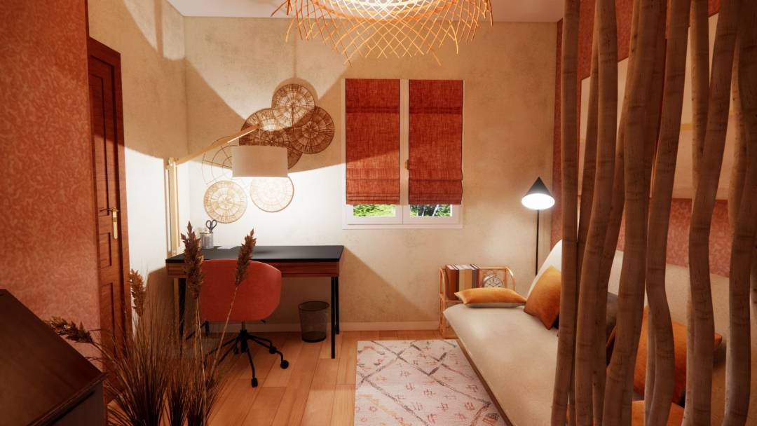 Rénovation, décoration d'une chambre, initialement d’enfant puis d’adolescent, exposée « Est ». Chambre d’appoint avec un espace de travail adapté à un adulte, dans une ambiance, à la fois propice à la détente et à la concentration. Les revêtements de sol et muraux : - Le parquet en chêne massif sera conservé. - Deux des murs revêtus d’un stuc rouge ocre seront maintenus, quant aux surfaces murales abîmées, elles seront recouvertes d’un papier peint intissé uni taloché taupe, lequel permettra de masquer des imperfections mineures. - Le plafond, déjà repeint, restera blanc. - Une baguette d’angle en bois foncé, un rappel des deux portes en bois, sera apposée le long de l’angle sortant de la pièce. Elle assurera la liaison entre papier peint et stuc. Le mobilier, luminaires et décoration : - Le secrétaire ancien sera maintenu à sa place actuelle, à côté duquel sera déposée une plante artificielle aux couleurs naturelles de beige et marron, laquelle agrémentera harmonieusement cette pièce s’ouvrant sur le jardin. - Le canapé clic clac sera maintenu le long du mur principal de la pièce, décalé du mur « fenêtre », il bénéficiera davantage de la lumière naturelle ; l’espace ainsi libéré pourra accueillir une liseuse en métal, ainsi qu’une petite étagère en rotin, support de livres, réveil ou autres effets personnels. Ce clic clac sera revêtu d’une housse et bande socle de couleur lin beige, pour parfaitement s’accorder avec l’ensemble des propositions répondant à l’esprit souhaité. - Pour davantage de confort, 5 coussins en lin, de couleurs ocre et taupe, viendront prendre place sur le canapé, alors qu’un épais tapis en laine, écru aux motifs berbères colorés, habillera chaleureusement le sol. - L’espace de travail sera illuminé par un lampadaire en bois naturel ; il sera doté d’un bureau 3 tiroirs en bois et métal noir, et d’un fauteuil en tissu saumon. - Une suspension aux fibres naturelles éclairera l’ensemble de la pièce. - Afin de préserver l’intimité : des stores en lin terracotta seront disposés sur les vantaux de la fenêtre, et un paravent en teck sera positionné face à l’entrée de la pièce. - Des décorations murales viendront parfaire l'ambiance recherchée.