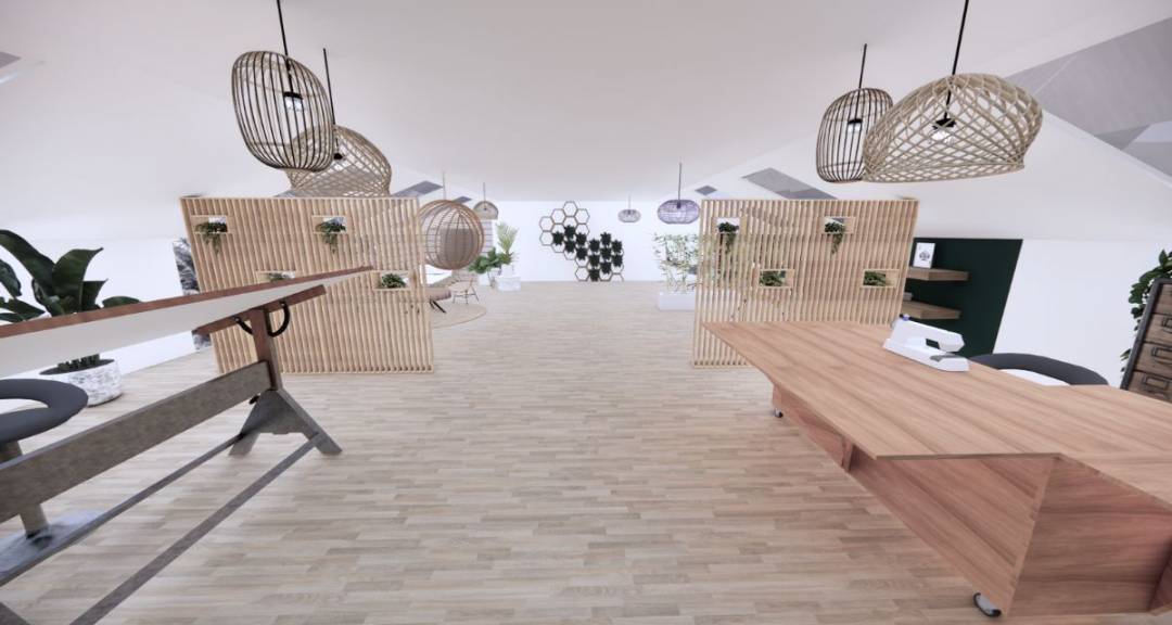 J'ai opté essentiellement pour des matériaux bruts comme le bois et le rotin pour rester dans l'esprit naturel de la jungle. De plus quelques touches de métal apportent un peu de modernité. Afin de garder un espace ouvert, j'ai séparé les différents espaces Ateliers, Bureau et Détente en utilisant des claustras en bois. Aussi vous remarquerez que les séparations de ces espaces sont réalisées grâce à des plantes hautes et des revêtements muraux (papier peint et peinture).