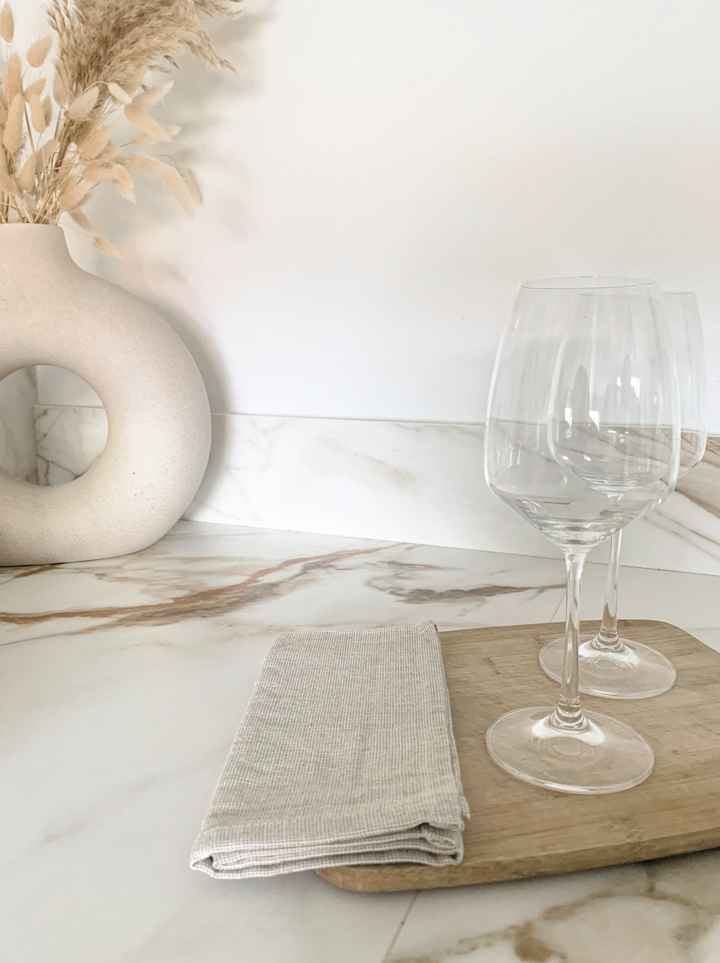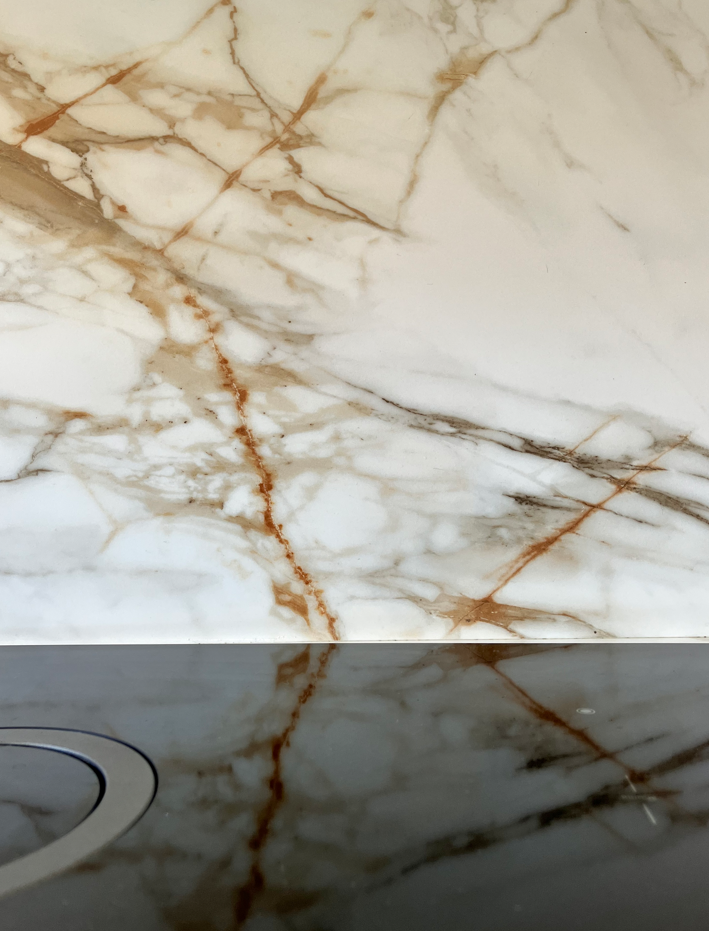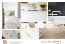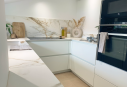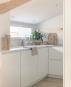 Dans le cadre de ce projet, l'objectif était de créer une cuisine lumineuse et épurée. À l'origine, cet espace était une salle de bain, ce qui a nécessité une réflexion approfondie sur la manière la plus efficace de la transformer en une cuisine fonctionnelle. Notre choix s'est porté sur une disposition en U, avec des meubles laqués mat coloris blanc pour gagner en luminosité. En ce qui concerne le plan de travail, nous avons opté pour une céramique Calacatta Gold qui dynamise l’ensemble. Une prise en main discrète contribue à alléger l'esthétique de la cuisine sans sacrifier l'ergonomie. Étant donné la hauteur sous plafond restreinte, l'ajout de meubles hauts n'était pas envisageable. Il fallait donc optimiser le rangement, pour cela nous avons incorporé deux tiroirs coulissants sous la colonne du four micro-ondes, ainsi qu'un troisième sous la colonne du réfrigérateur. Pour la hotte nous l’avons combinée à la table de cuisson grâce à une plaque aspirante. En ce qui concerne le revêtement de sol, le choix s’est porté sur un carrelage effet chêne clair pour s’accorder avec la poutre et apporter toujours plus de luminosité à la cuisine. Il permet également d’apporter une touche chaleureuse à l’ensemble.