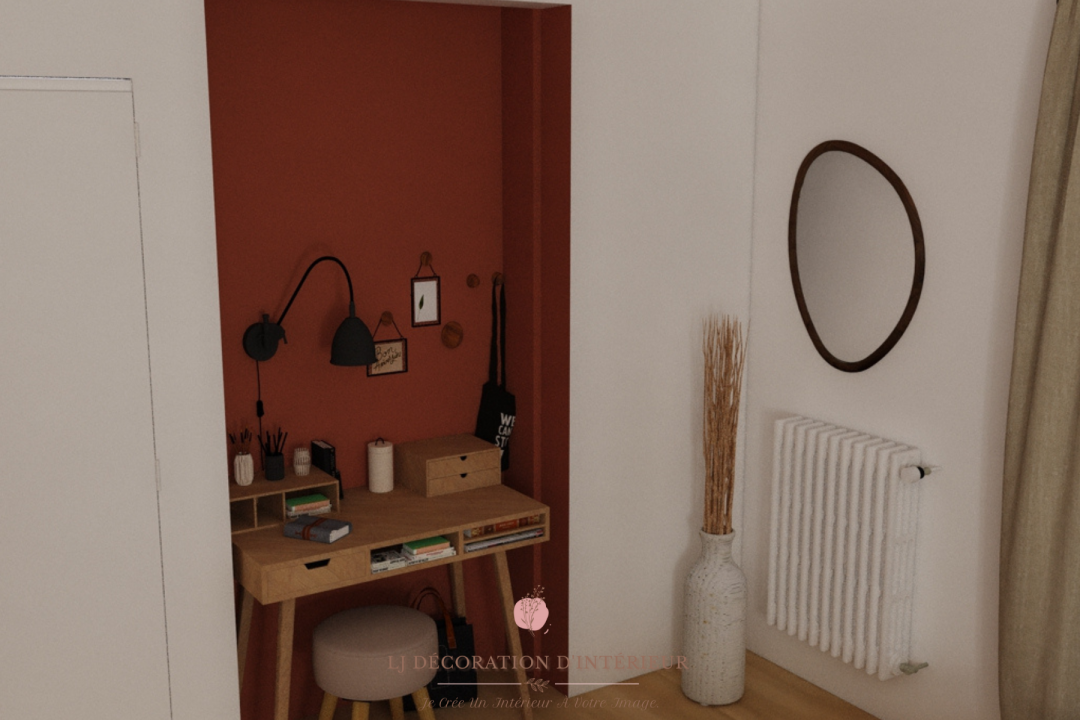 Les clients bénéficiaient d'une pièce un plus dans leur maison et souhaitaient l'optimiser soit en bureau, soit en chambre d'amis. Après réflexion nous avons décidé de réaliser une chambre d'amis et d'y installer un coin bureau.