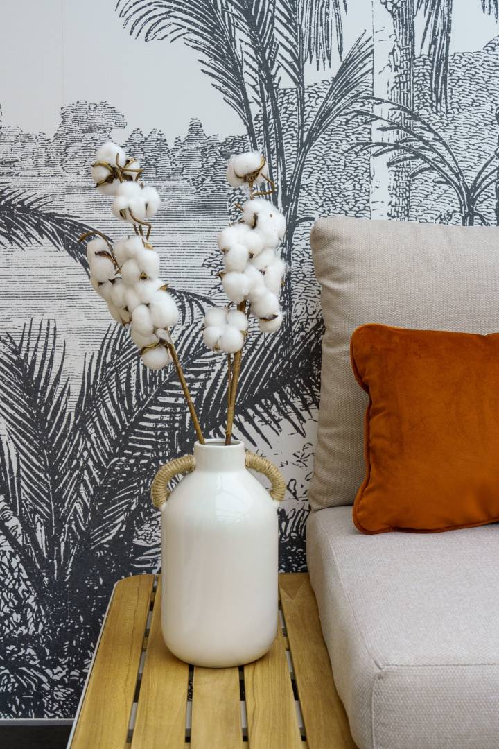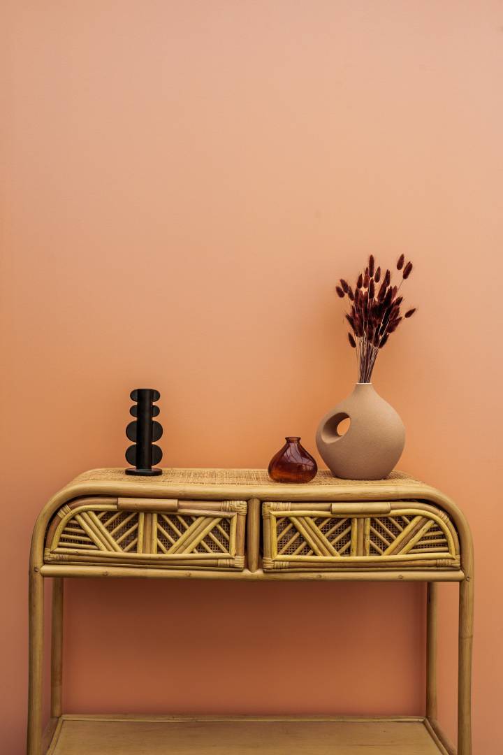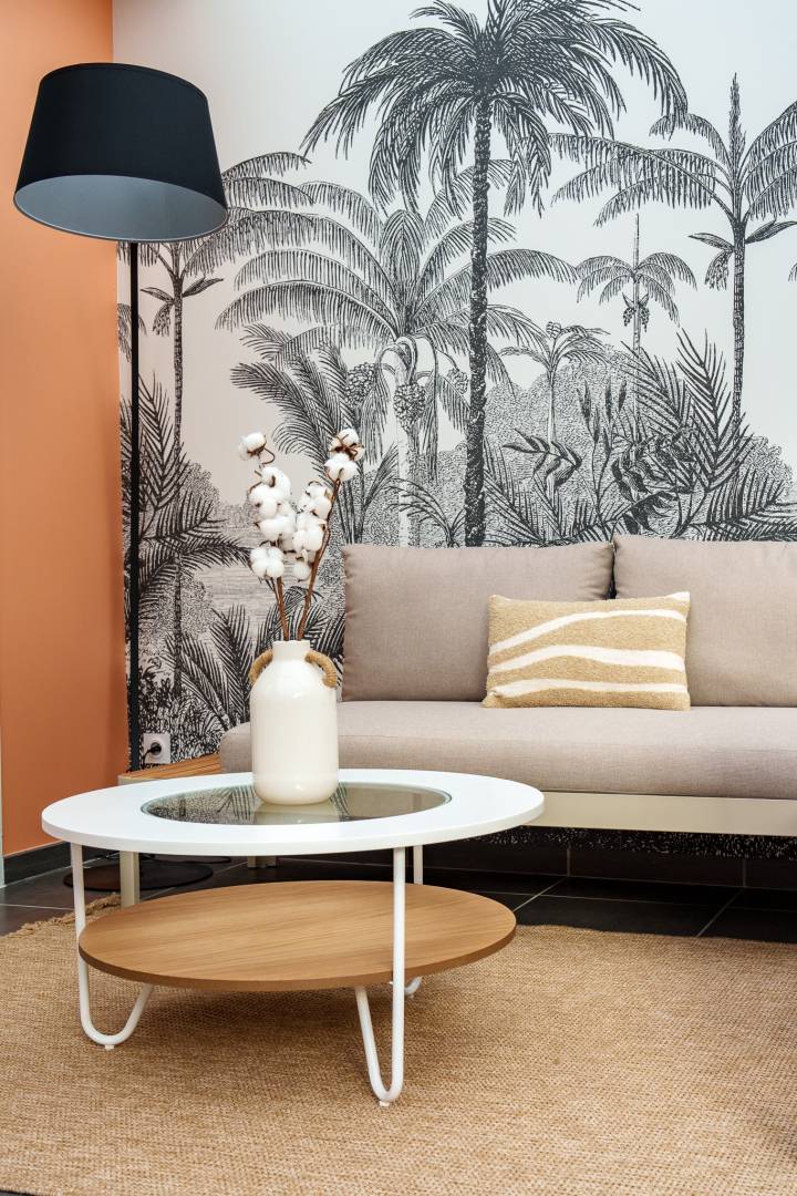 Ma cliente avait besoin d’aide pour redonner vie à cette pièce laissée à l’abandon. Grâce à la superficie de 30m², nous avons pu créer deux espaces distincts ; un côté salle à manger et un côté salon pour se détendre.  L’objectif : créer une pièce de vie colorée et naturelle. Nous avons opté pour une couleur pêche, associée à un papier peint tropical noir et blanc et des matériaux naturels comme le bois et le jute. Le revêtement de sol, refait à neuf il y a peu de temps, a été conservé. Un accompagnement personnalisé de A à Z a permis à ma cliente d’obtenir une pièce qui représente au mieux sa personnalité.