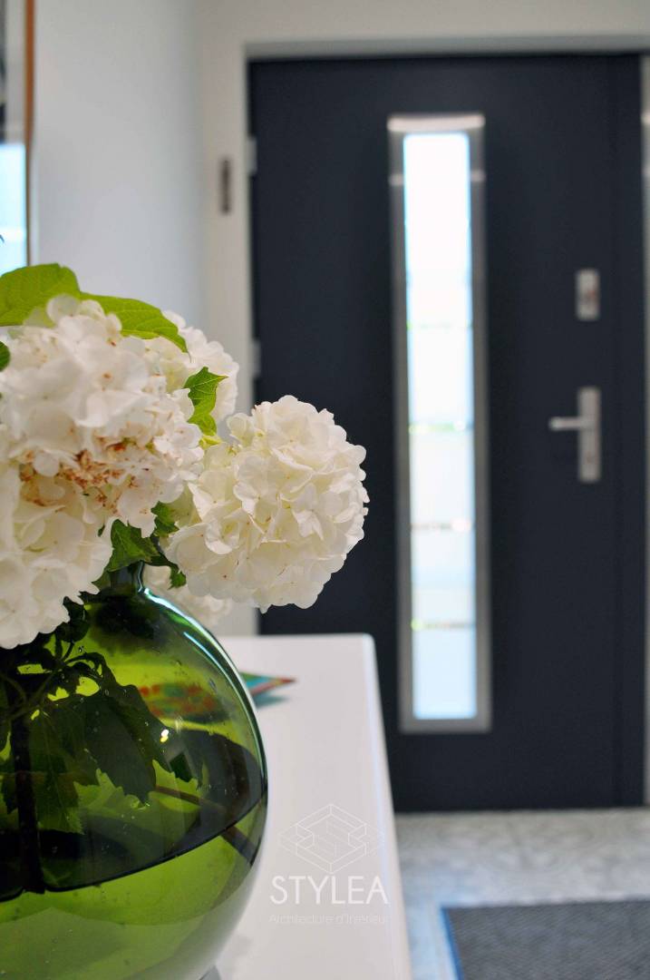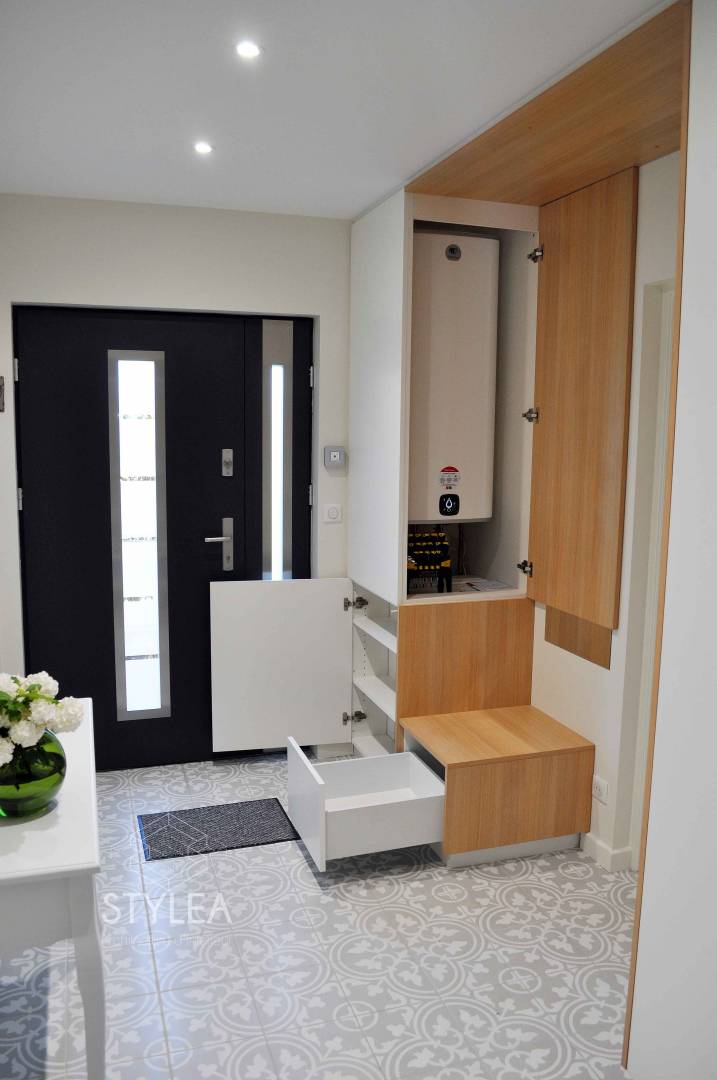 Cette famille a fait appel à STYLEA Architecture d'intérieur afin de trouver une solution pour leur maison sans veritable entrée. J'ai donc réalisé celle ci dans le cellier et déplacé ce dernier dans le garage avec la buanderie. On a optimisé les rangements tout en dissimulant le cumulus, crée du dressing sur mesure et fait entrer de la lumière avec une porte tiercée. Niveau décoration, tout en sobriété: blanc, bois et carreaux ciments gris.