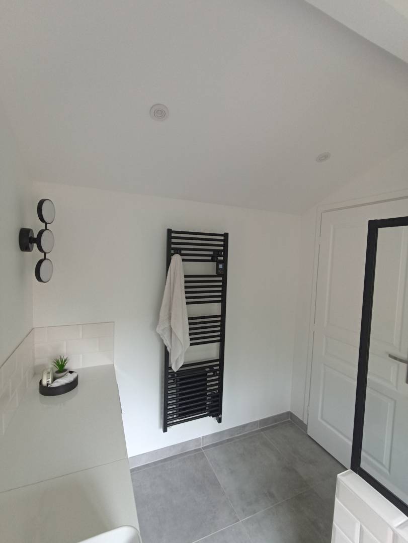 Rénovation complète pour cette salle d'eau dont le lumière manquait beaucoup dans cette salle d'eau destinée à lajeune fille de la maison. Ses parents on fait appel à moi pour résoudre le problème de lumière, d'humidité et de rangement et surtout créer un grand plan de travail. Pari réussi avec une ambiance en noir et blanc relevée d'une touche de bois. La verrière atelier laisse enfin passer la lumière.