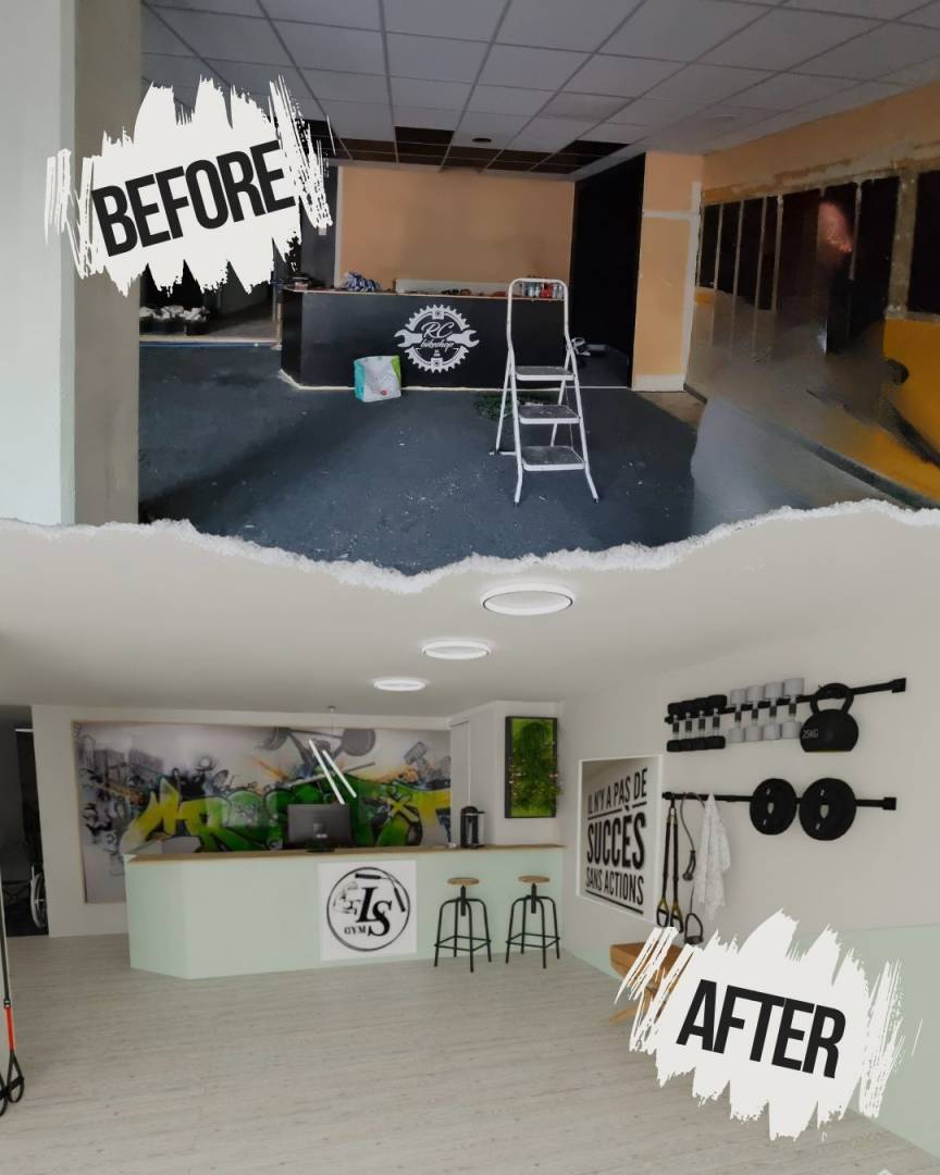 Cet ancien local commercial a été transformé en salle de sport. La cliente souhaitait apporter une touche d'originalité et de personnalité à cette salle afin qu'elle ne ressemble pas à toutes celles des anciennes connues actuellement.
