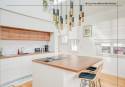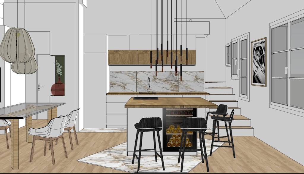 Réalisation et agencement d'une cuisine dans un loft. Changement de destination pour cette cuisine qui était étroite dans un couloir et mal éclairée ! La cuisine a donc été déplacée sous l'escalier dans la pièce principale de vie pour mieux convenir au style de vie de mes clients. Défi pour les électriciens qui ont installés les luminaires à plus de 5 m de haut ! Choix des matériaux, carrelage, luminaires sur mesure, choix du mobilier, des couleurs...