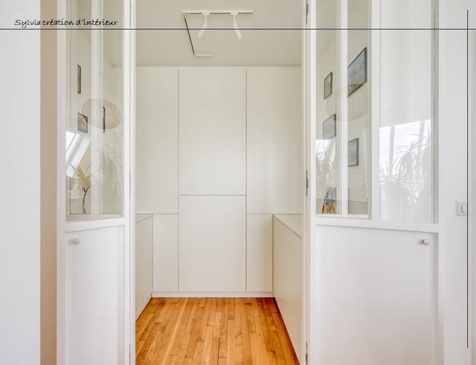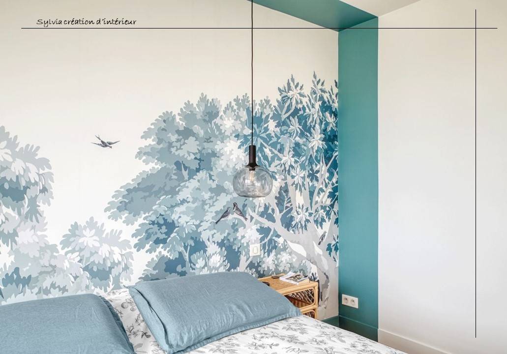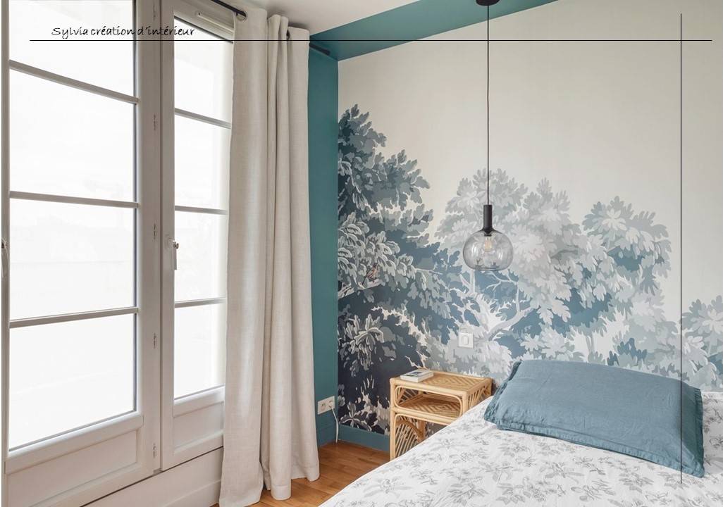 Rénovation d'un appartement avec aménagement d'une chambre parentale avec un joli papier peint, luminaires et dressing attenant sur mesure pour s'insérer parfaitement dans l'espace, nous avons conservé le parquet d'origine qui a été rénové.