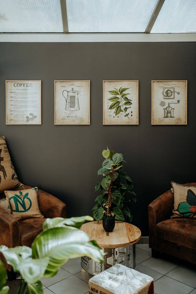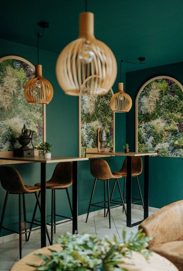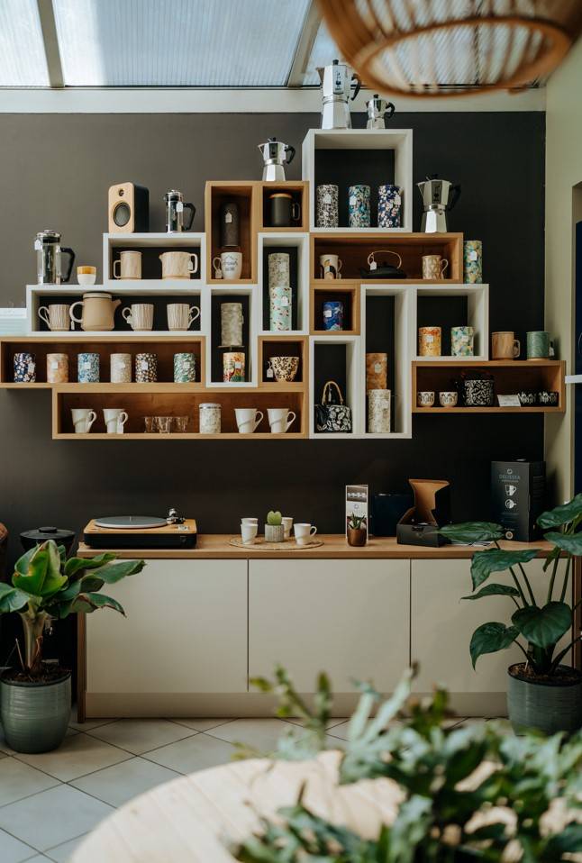Décoration d'un espace dégustation chez un torréfacteur du Mans. Choix des couleurs, papier peint, mobilier, décoration, création de rangements sur mesure adaptés aux besoins du café. Un espace détente cosy pour apprécier un bon café ou un thé et pourquoi pas repartir avec un joli mug ou un coffret de dégustation...