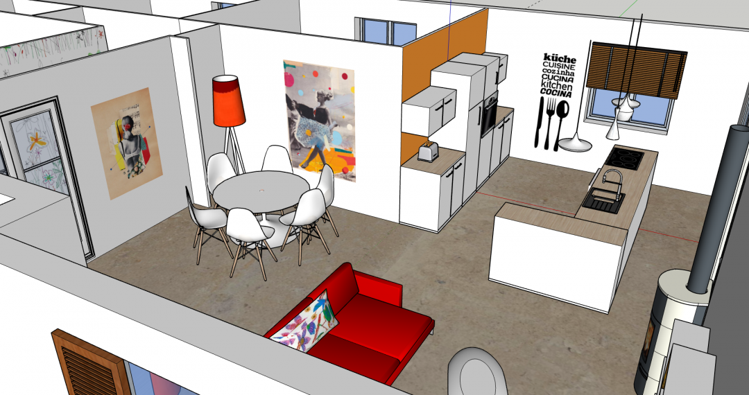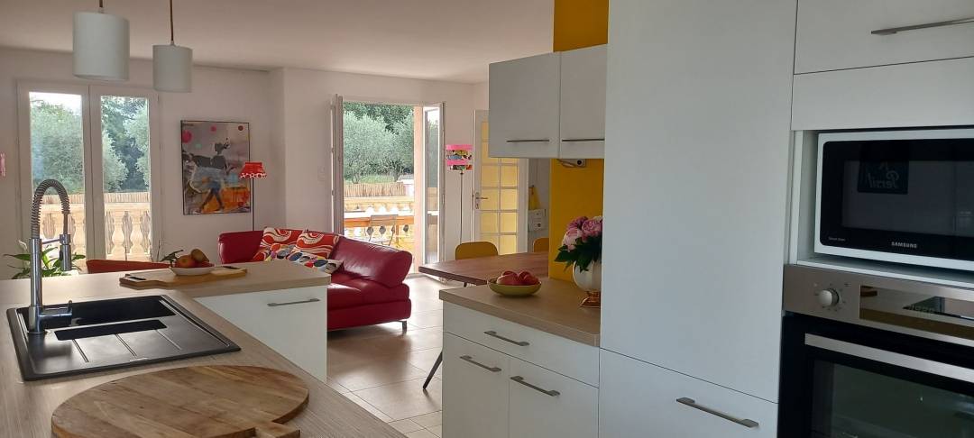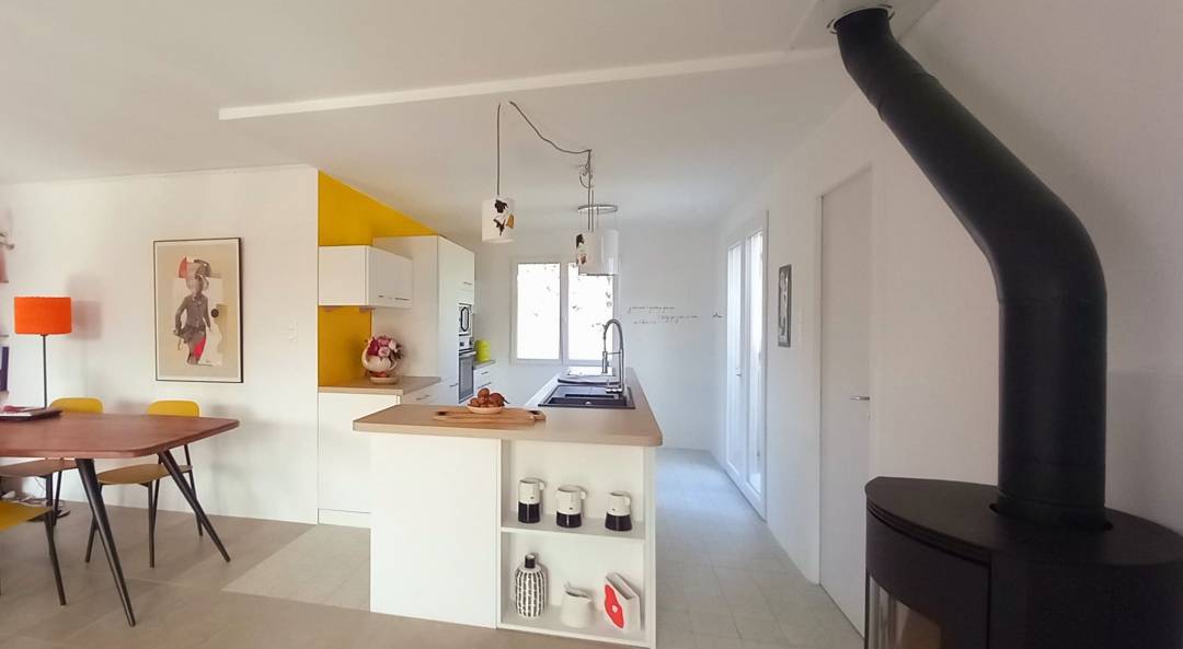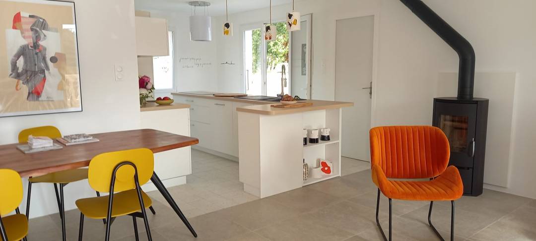 Rénovation d'une maison - Serendipity Uzès Rénovation d’une maison, création d'un lieu de vie commun, qui réunit une nouvelle cuisine, une salle à manger et un salon. Afin d’obtenir ce nouvel espace de vie, nous avons cassé le mur de séparation de l’ancien salon de la petite salle à manger. Pour obtenir une belle lumière « côté Est » et profiter de la vue sur le jardin, nous avons effectué une ouverture dans le mur pour installer une baie vitrée dans l’espace cuisine. Dans le cadre de ce projet, le visuel 3D a permis au client de se projeter dans son futur univers de vie et d'en découvrir les volumes, ainsi que de dessiner l’implantation de la cuisine, qui nous a permis d’obtenir des devis auprès des cuisinistes. En concertation avec le client, nous avons pris en charge ; l’élaboration du cahier des charges, le choix des différents matériaux et mobiliers, géré les interventions des artisans : électricien, plombier, plaquiste, carreleur, chauffagiste, peintre… Et la décoration d’intérieur… Les abat-jour ont été réalisés par Katty Chacun