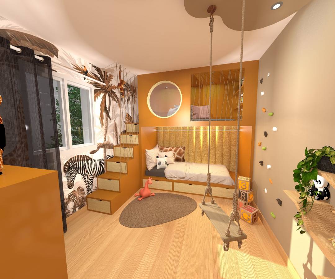 Chambre d'enfant digne de la jungle ! Bien que le vert soit la couleur symbolisant la nature, ici on opte pour le orange, couleur mixte et vive présente pour la structure du lit cabane. Ce ton est apaisé par une teinte beige et une fresque animalière aux tons chauds. Une étagère "baobab" est présente en angle de pièce afin d'habiller l'espace, de créer du rangement et de fixer une balançoire. Photos complémentaires du projet sur le lien ci-dessous : https://portfoliokersalenoella.jimdofree.com/projets-interieurs/