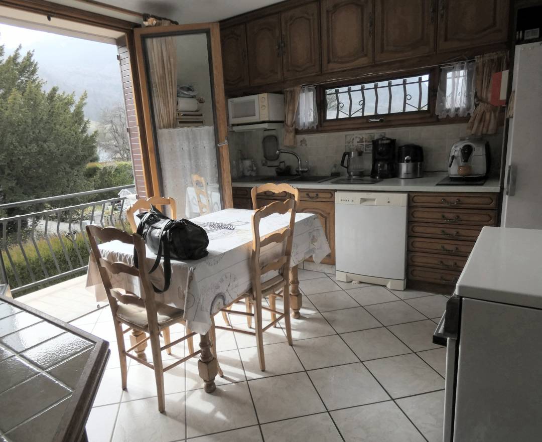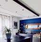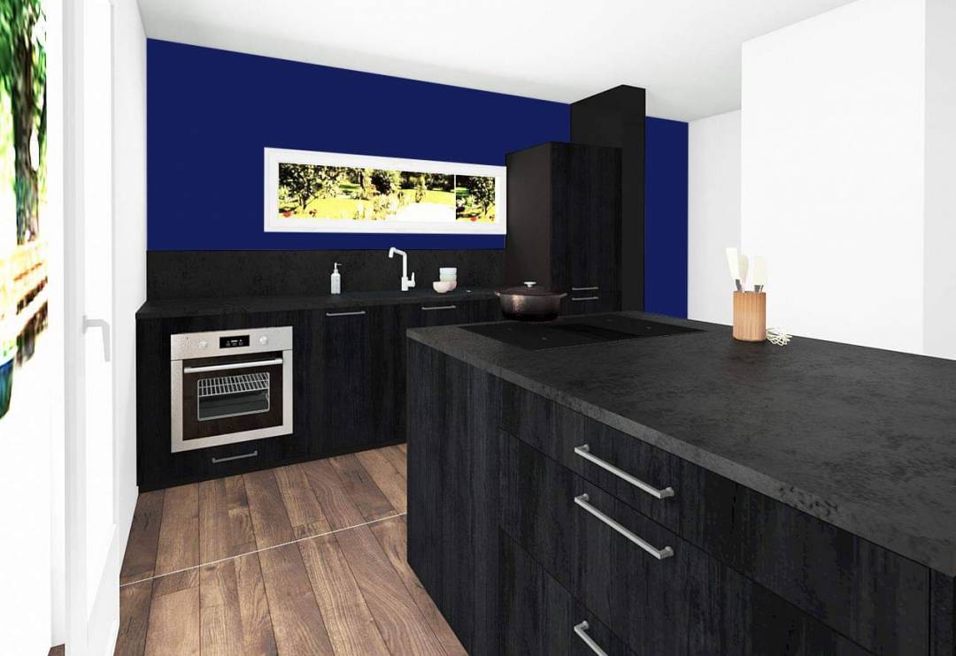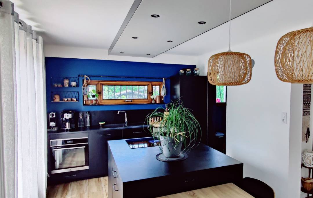 Une cuisine au look noir. A l'origine, la cuisine était fermée avec des meubles en bois rustiques. Elle est exposée plein sud. La sobriété du noir se mélange très bien avec les murs blancs et bleus. Une toile tendue avec luminaire à été créée pour délimiter la cuisine dans cette grande pièce ouverte.