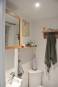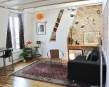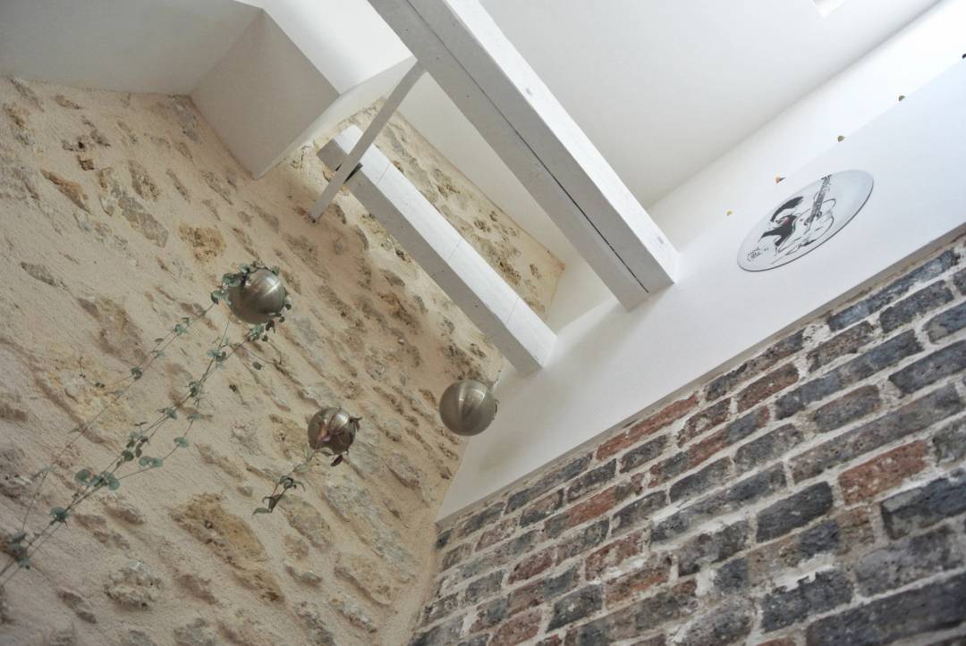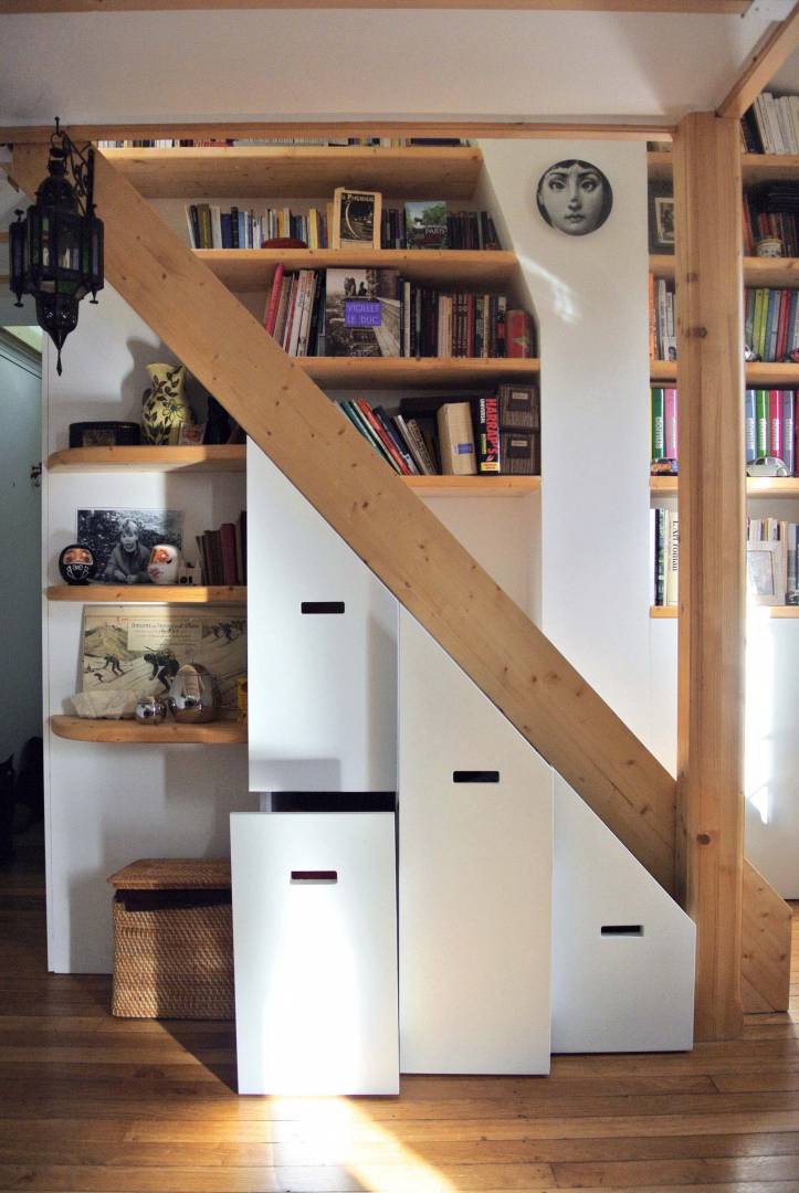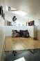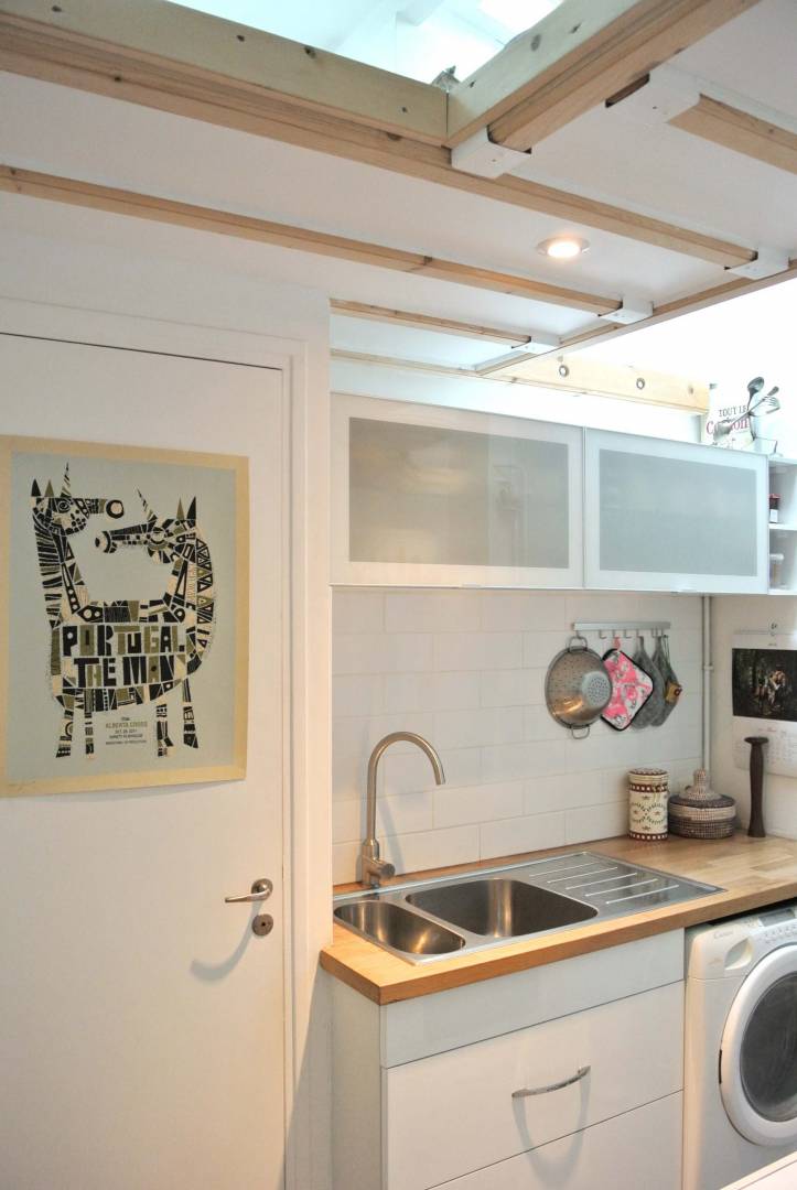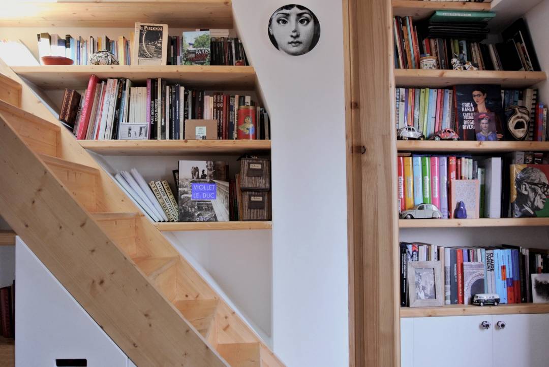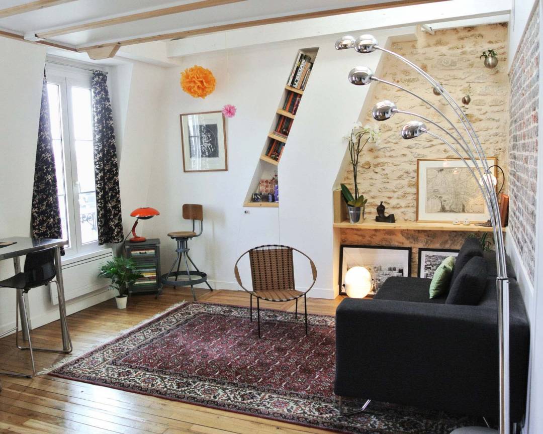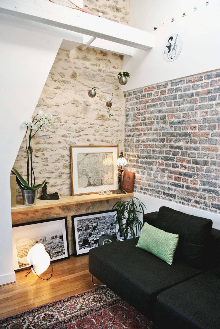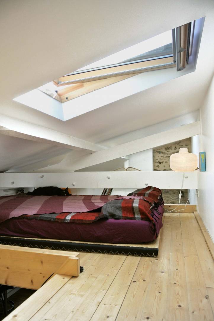 Rénovation originale et complète d’une pièce de vie de 27m2. Grâce à l’achat des combles inexploités au-dessus du studio et à la démolition du plancher, nous avons ajouté 1/4 de volume à l’existant. Une mezzanine a été créée au-dessus de la cuisine et de la salle de bain et dédiée à l’espace nuit afin de rentabiliser l’espace habitable. Une rénovation complète du sol au plafond a été effectuée. L’opération consistait à refaire la plomberie, l’électricité, la peinture et à mettre en œuvre une charpente en bois et une isolation du toit. La création de quatre nouvelles ouvertures sur le toit ajoute du charme et de la lumière zénithale. Le mobilier intégré, entièrement dessiné sur-mesure, a été pensé comme un élément graphique, épousant l’architecture du lieu. Les rangements sur mesure en sapin clair permettent de rentabiliser l’espace. Le blanc domine pour renforcer la luminosité, le mur pignon est mis à pierre vue, ainsi qu’une partie du mur en brique rouge. Cela permet de définir une espace salon chaleureux et original.