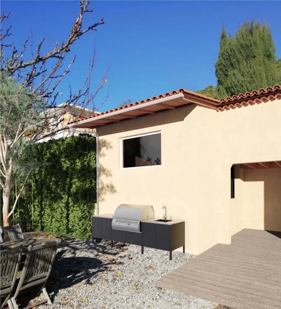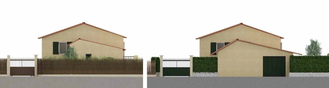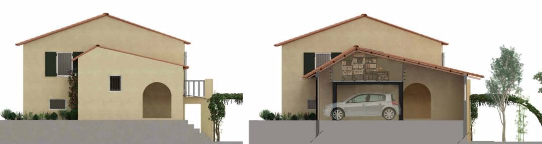 Le projet porte sur la création d’un garage de 30 m2 à côté de la maison existante pour une voiture et deux deux-roues, selon les besoins des propriétaires. Le volume du garage est en continuité avec la maison, la toiture en tuiles reprend la même inclinaison de l’existante, l’ancien portail sera remplacé avec un autre à l’identique mais coulissant sur le mur voisin. La hauteur de l’extension permet l’installation d’une mezzanine pour exploiter au mieux le volume du garage.