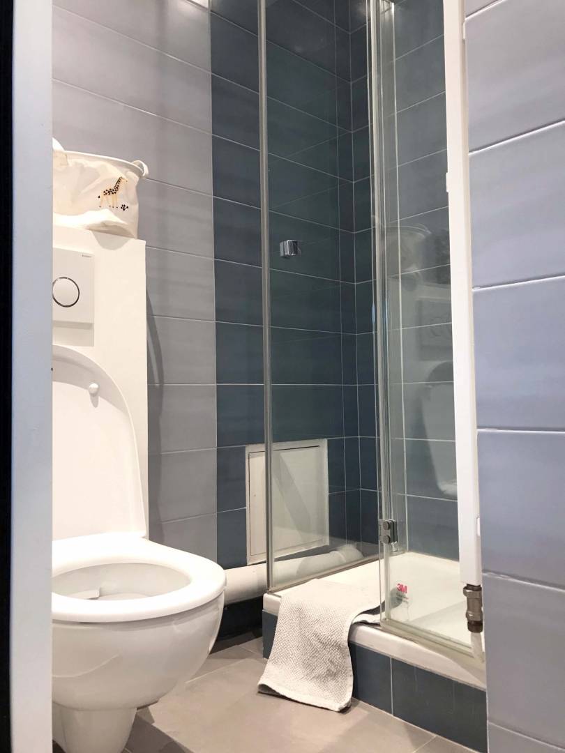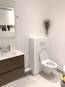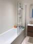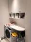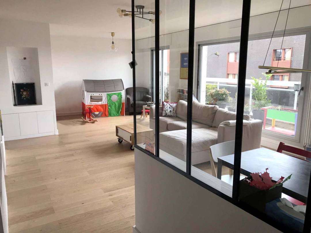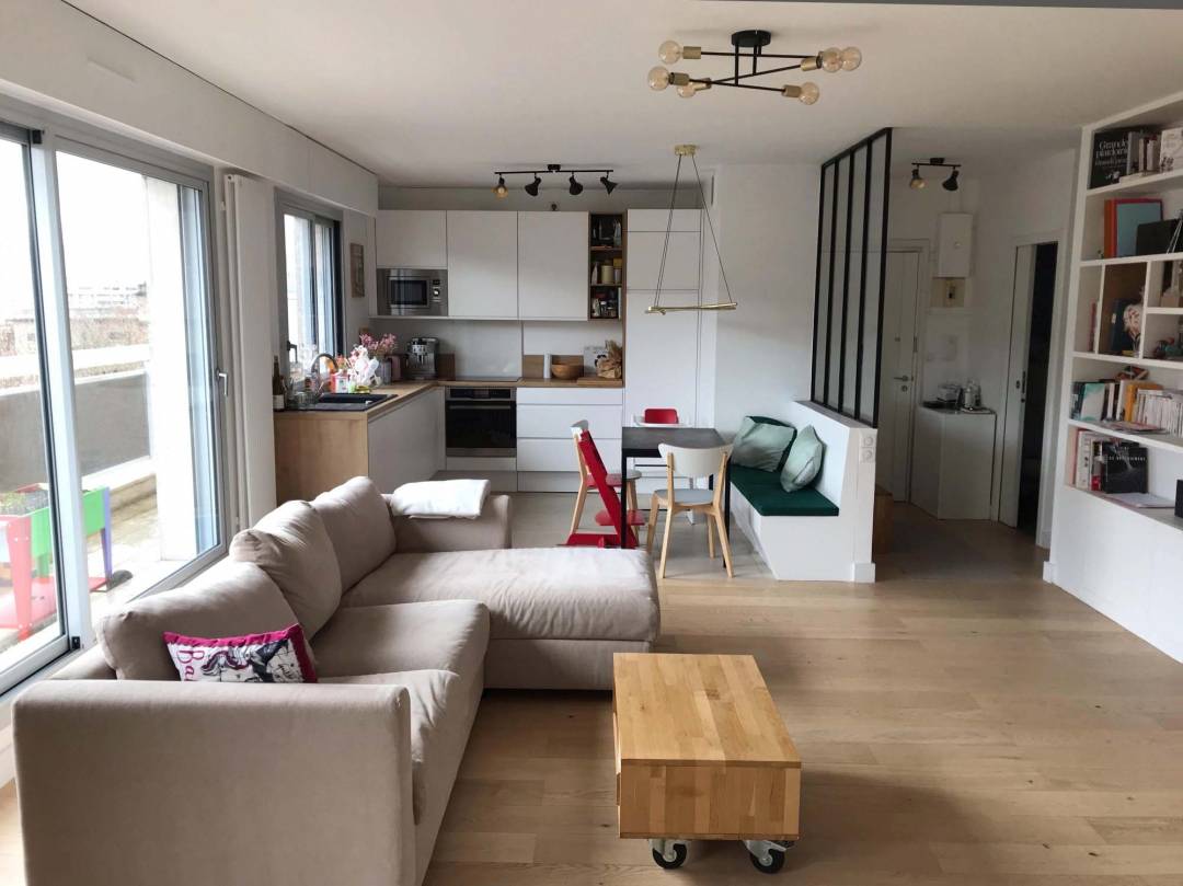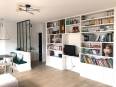 Le projet prévoit la rénovation de l’espace salon-cuisine et des deux sdb. La démolition de trois cloisons a permis de créer une grande espace de vie ouverte vers la cuisine. La mise en place d’une verrière a permis d’ajouter de la luminosité à l’entrée et de donner plus de caractère à l’espace de la salle à manger. La rénovation est en style épuré et contemporain ; la création des bibliothèques sur mesure donne une unité à l’ensemble. Sur le plan esthétique, ont été privilégié des matériaux sobres et simples.