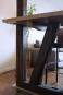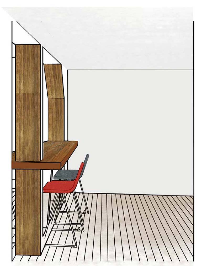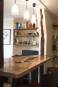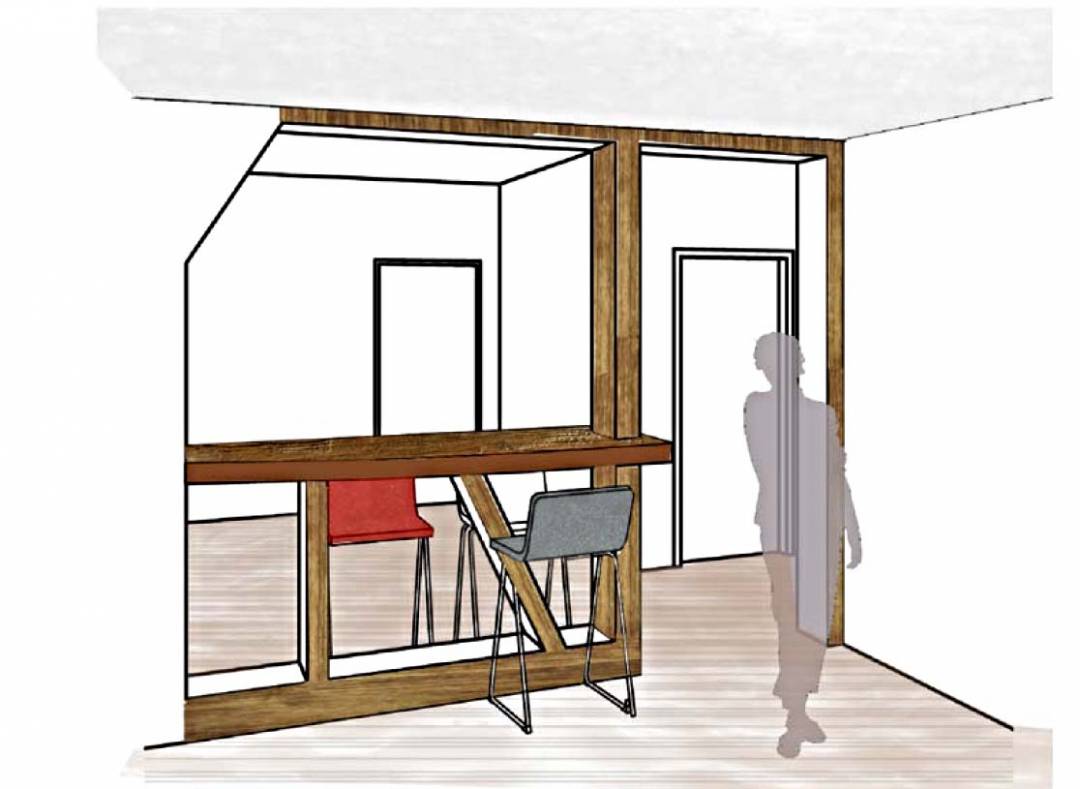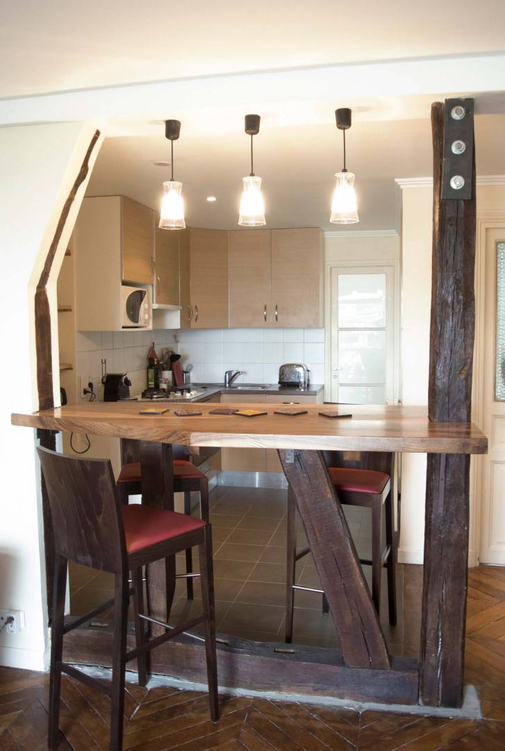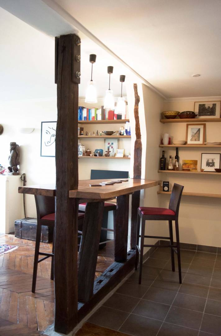 Le propriétaire souhaitait optimiser sa cuisine très sombre en vue de créer un espace unique avec le salon. Le mur porteur en pan de bois, entre l’ancienne cuisine et le salon a été en partie démoli. La mise en place de deux plats métalliques tout le long de l’ancienne poutre en bois, a permis la création d’une ouverture importante. Les poutres en bois d’origine, ont été en partie conservé et utilisé comme pieds de la nouvelle table. La planche en noyer massive de 5 cm d’épaisseur a été réalisé par un menuisier ébéniste. Elle a été traité avec un vernis transparent qui laisse voir les nervures du bois.