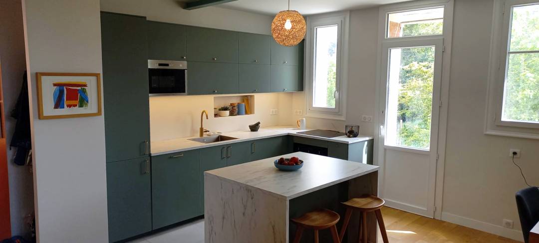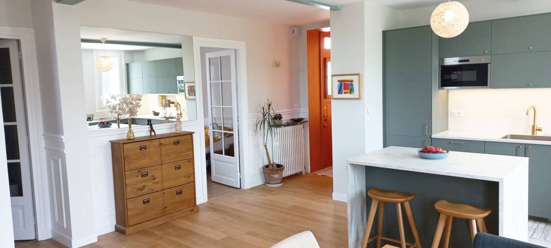 Soline & Victor ont souhaité donner un coup de jeune à la belle maison meulière qu’ils venaient d’acheter en région parisienne pour leur petite famille. L’objectif était de décloisonner en supprimant deux murs porteurs, pour réaliser une nouvelle grande pièce de vie (entrée/cuisine/séjour) de 40 m² beaucoup plus chaleureuse. Choix des couleurs, du mobilier, définition de l’aménagement de la pièce…le challenge rêvé pour une décoratrice d’intérieur !