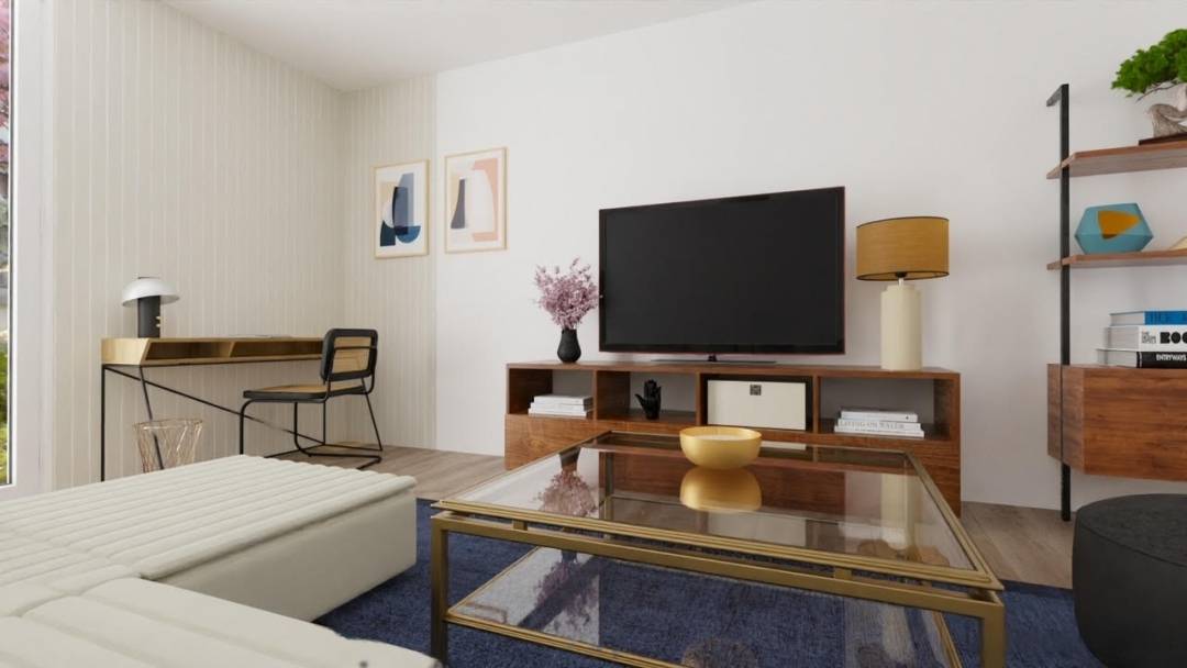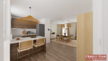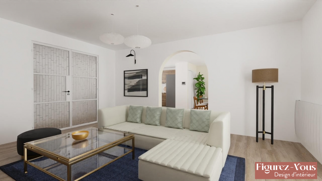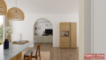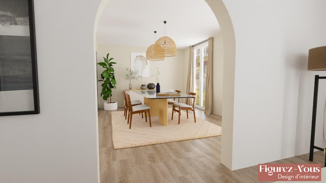 Karell, Conseillère immobilière en Bourgogne, m'a sollicitée dans le cadre d'un projet de Home staging virtuel afin de l'aider à valoriser une maison de son portefeuille en vente, aujourd'hui dans son "jus", mais avec un gros potentiel. Ma 1ère mission a consisté à créer une suite parentale (visible dans "Réalisations"). Ma 2nde mission a consisté à repenser l'aménagement et rafraîchir la décoration d'une cuisine ouverte sur salle à manger, attenantes à un salon. La proposition faite a été de décloisonner afin de fluidifier le passage d'une pièce à l'autre en créant une seule et même grande pièce à vivre grâce à l'ouverture du mur porteur (via IPN, et donc nécessité de recourir à un Bureau d'Etudes Techniques). Les matériaux et la décoration ont été pensés de façon à créer une pièce harmonieuse, à la fois sobre et chaleureuse, grâce au bois et aux couleurs douces retenus.
