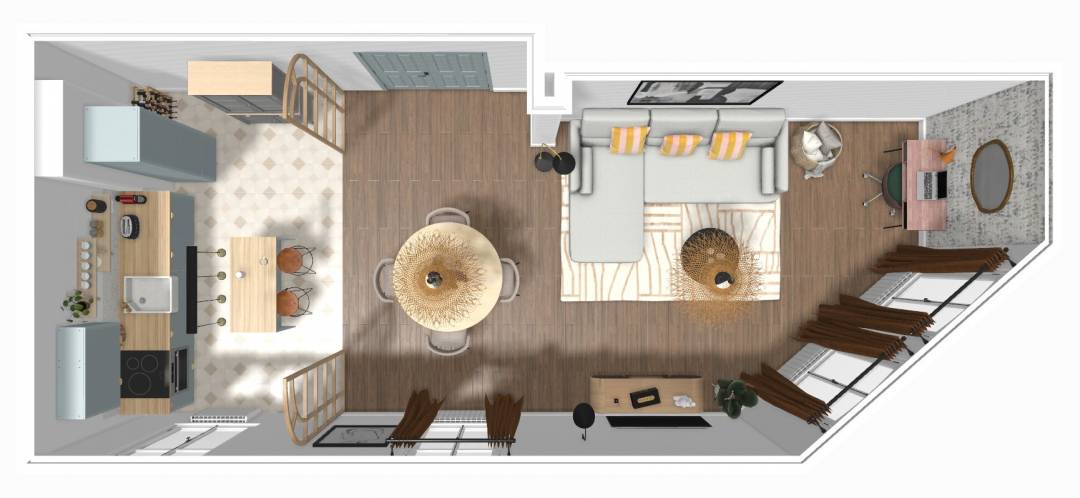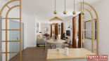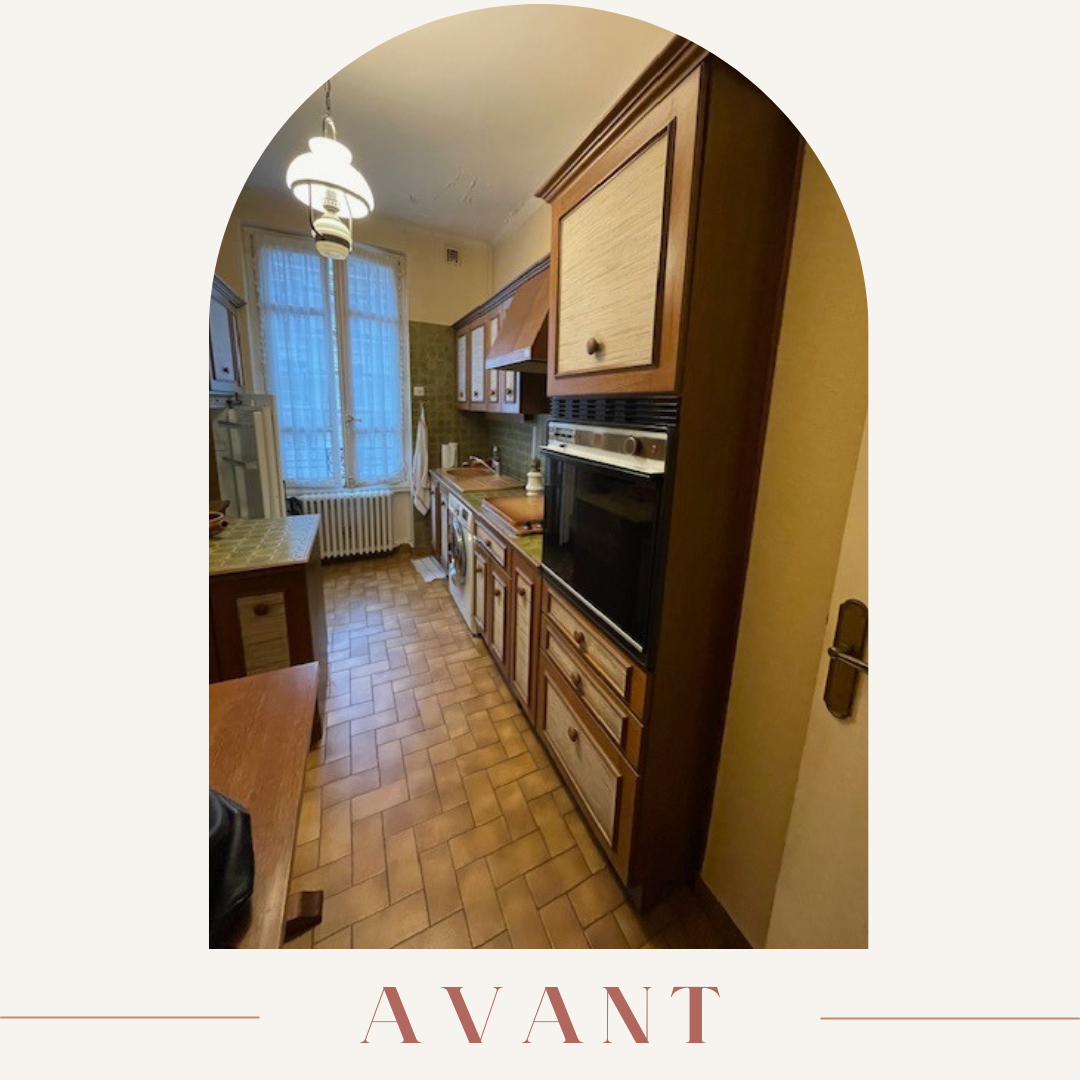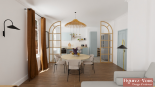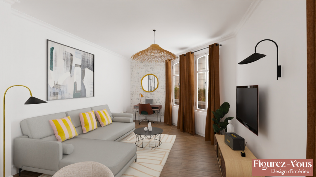 Sollicitée par une agence immobilière pour valoriser un bien ancien en vente à Lyon 7ème, je suis intervenue afin de proposer une projection des travaux qui pourraient être réalisés dans le but de moderniser cet appartement plein de potentiel.  La proposition faite a été de créer une grande pièce de vie fonctionnelle et conviviale en démolissant la cloison séparative entre la cuisine actuellement fermée et le séjour. La cuisine a été repensée afin de la moderniser, avec également l'ajout d'un petit îlot pour concilier moments de partage et praticité.  La verrière arrondie en bois et le nouveau carrelage permettent quant à eux de délimiter visuellement l'espace cuisine, tout en maximisant fluidité de circulation et lumière. Le séjour a lui aussi été optimisé, notamment avec l'ajout d'un coin bureau côté salon.