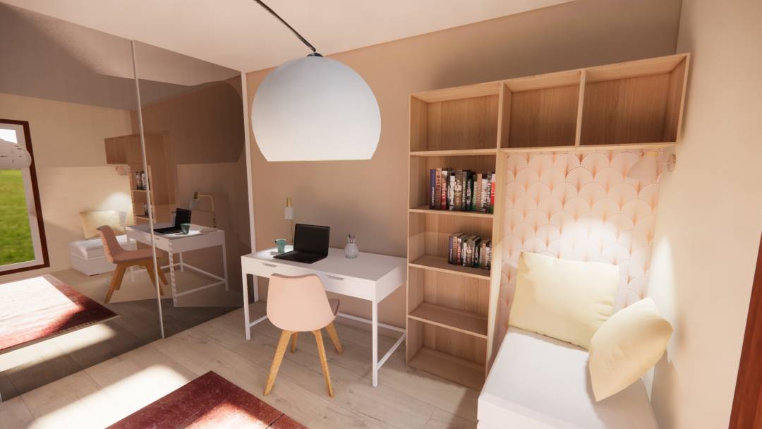 Le souhait de ma cliente est de transformer la chambre parentale en bureau avec des solutions pour augmenter la capacité de sa bibliothèque et transformer le bureau actuel en chambre. Pour la chambre, un papier peint panoramique aux tons beiges rosés aux nuances douces et féminines. Pour le bureau, le même beige rosé avec un coin bibliothèque avec un pouf et une liseuse au niveau du meuble pour créer un coin cosy. Un tapis a été ajouté pour apporter de la chaleur. Le fauteuil enveloppant finalise la touche cosy de ces 2 pièces.