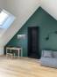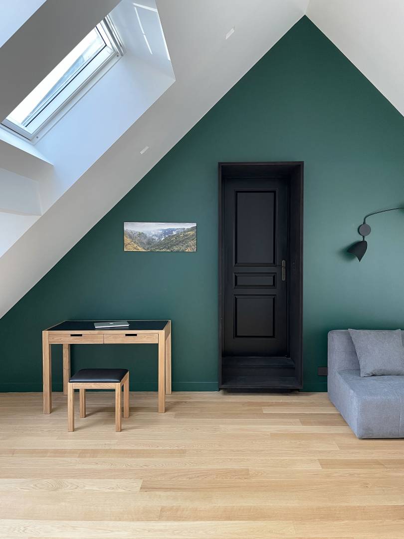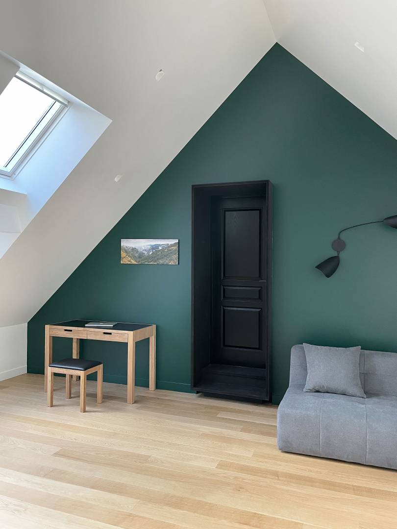 De nombreuses maisons individuelles, aux toitures imposantes n’exploitent pas les volumes insolites de leurs combles. Le souhait de la maîtrise d’ouvrage ici, était tout le contraire : donner un usage à ce volume inutilisé. Il est venu naturellement le projet d’aménager une salle de jeux pour toute la famille. L’aménagement simple et minimaliste restitue l’émotion que procure un tel espace. Une embrasure noire, comme un seuil à traverser, permet d’accéder à la pièce qui apparaît alors inondée de lumière grâce aux fenêtres de toit. Ce n’est qu’une fois à l’intérieur que l’on peut se retourner face à un mur vert ronce, monumentale, qui souligne la géométrie particulière du volume. Le parquet en chêne clair transforme la pièce en repère sobre, chaleureux, empreint d’une ambiance apaisante propice à la détente.