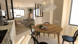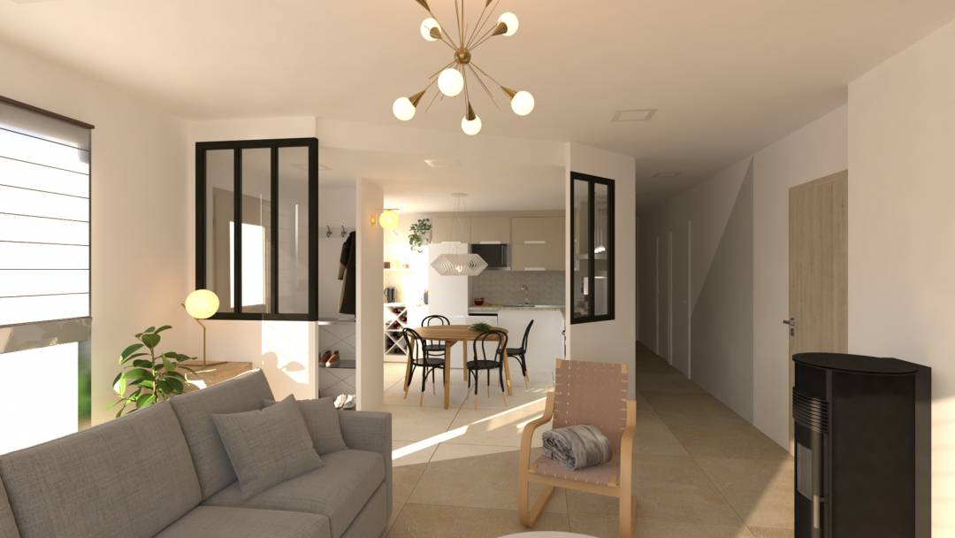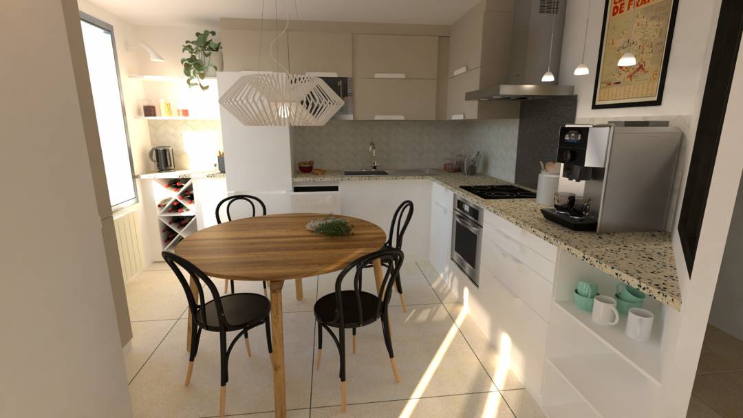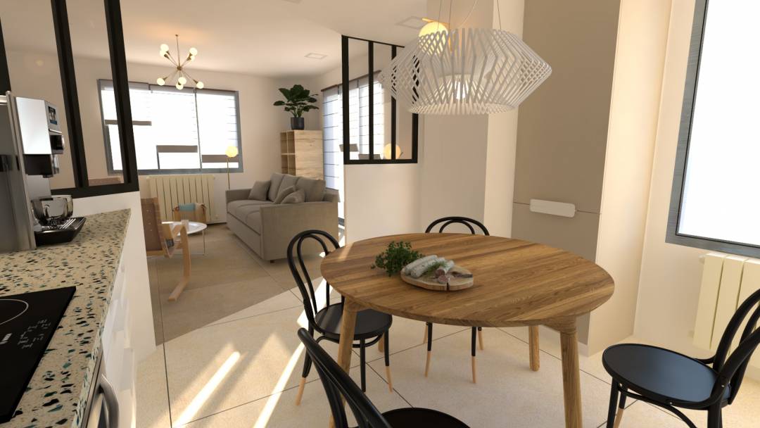 L'espace a totalement été repensé pour répondre au mieux au besoin du client et lui apporter un espace unique. L'entrée est isolée du reste de la pièce et permet de poser les manteaux et chaussures dans un espace dédié. La cuisine est plus fonctionnelle avec de nombreux rangements supplémentaires, et le salon est épuré et offre un espace de détente et convival. Merci à P. pour sa confiance !