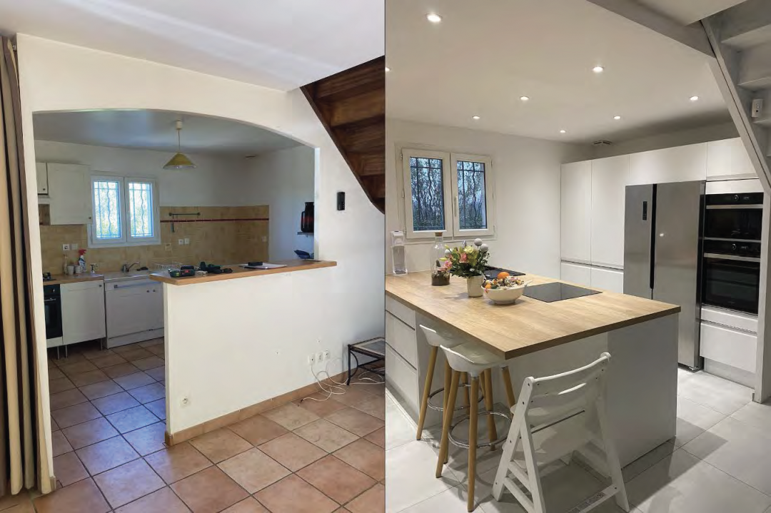 Ouverture des espaces afin de créer une cuisine ouverte, création d'un faux plafond. Changement des revêtements de sol. Rafraichissement des peintures. Changement des éléments de cuisine.