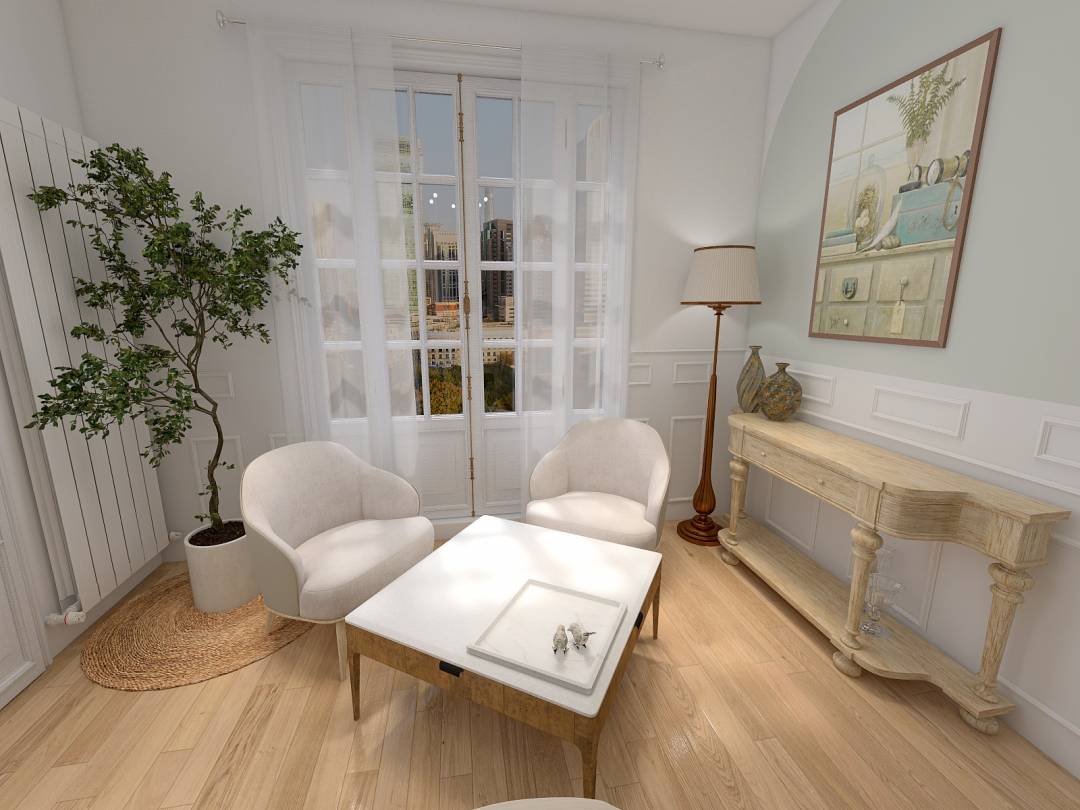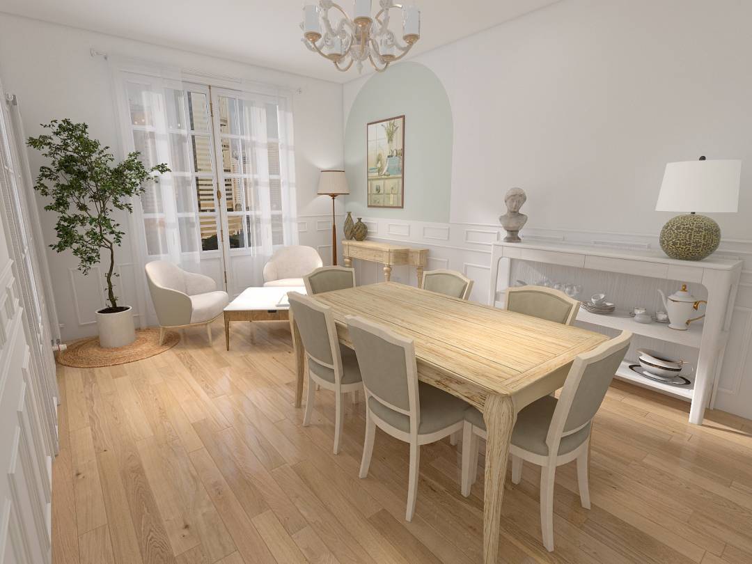 Projection 3D pour permettre aux futurs acquéreurs de mieux se projeter dans cette salle de vie, de cet appartement haussmannien