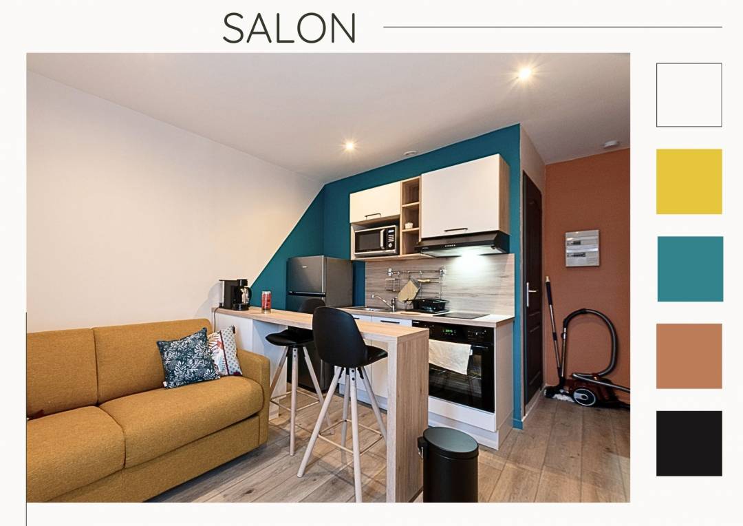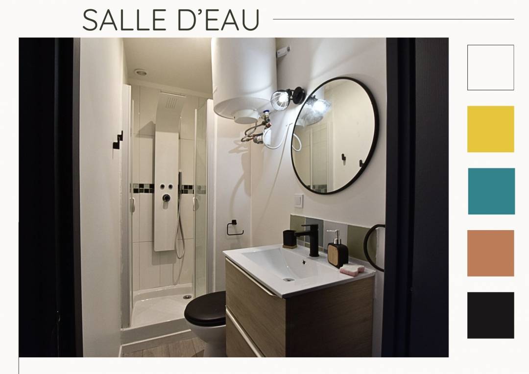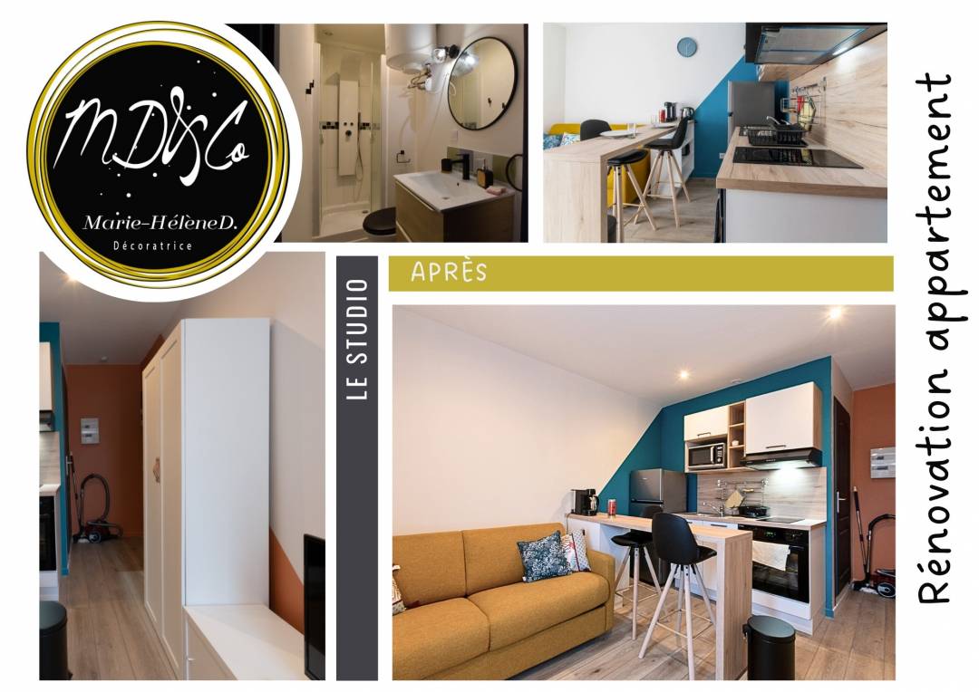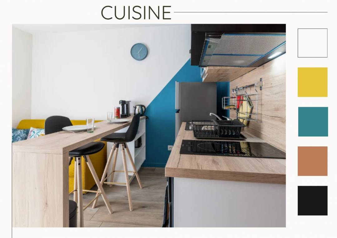Rénovation d'un studio pour la location Airbnb : optimiser l'espace et créer une ambiance chaleureuse Le défi : Transformer un studio de 15 m² en un espace Airbnb confortable et moderne, en prenant en compte les exigences de la location de courte durée La solution : un aménagement millimétré : chaque recoin a été exploité pour maximiser l'espace et le confort un design fonctionnel : le choix du mobilier et des équipements a été pensé pour répondre aux besoins des voyageurs une ambiance vibrante : une palette de couleurs énergisantes et des touches de bois apportent chaleur et dynamisme à l'espace Le résultat : Un studio optimisé et élégant, prêt à accueillir des voyageurs pour un séjour inoubliable.