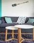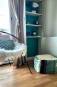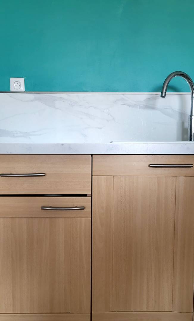 Le mur turquoise fait écho aux tons du reste de l'appartement. Quant au plan de travail effet marbre, il apporte une touche d'élégance à l'ensemble.