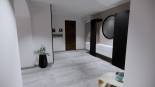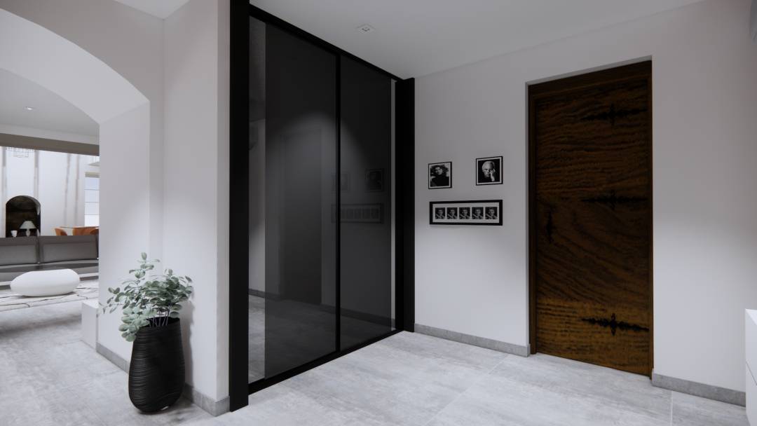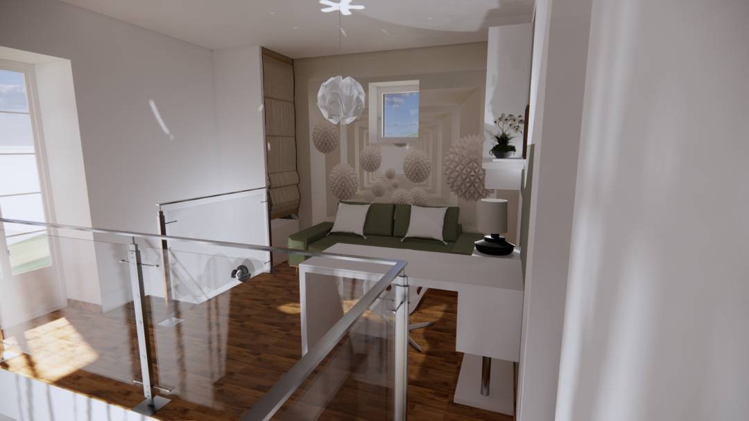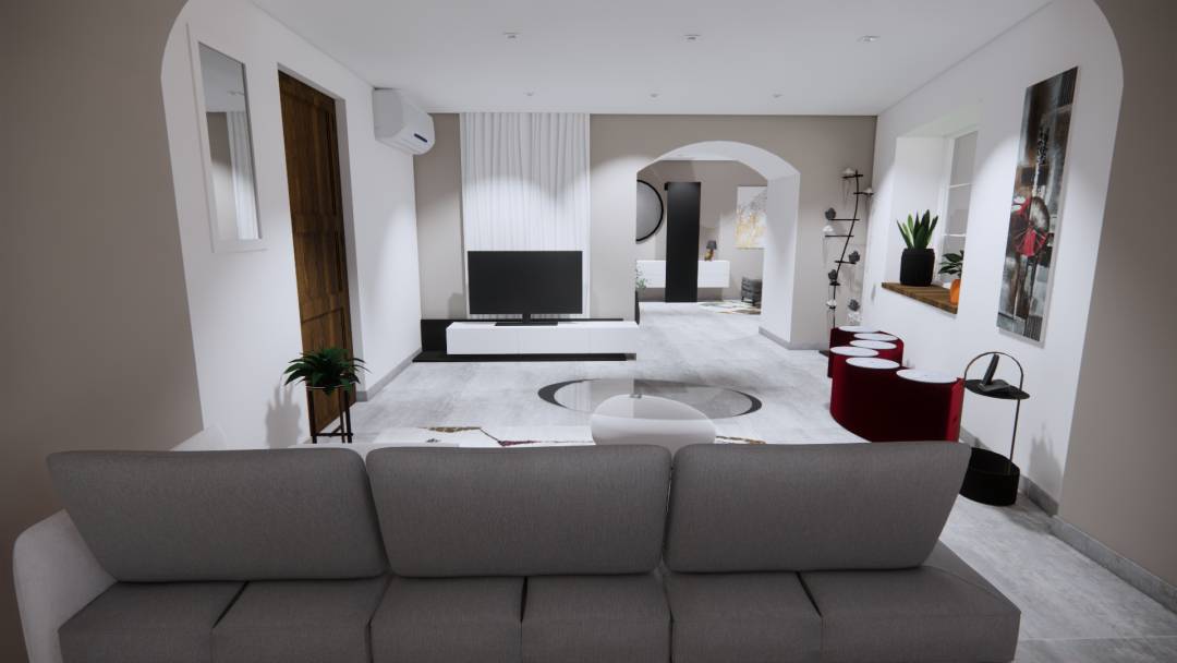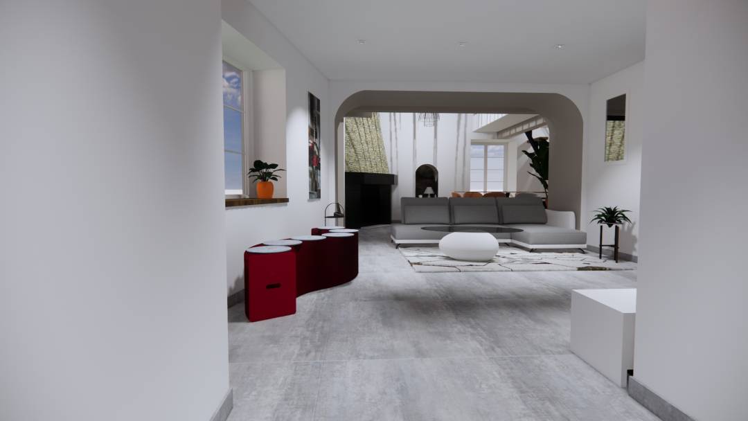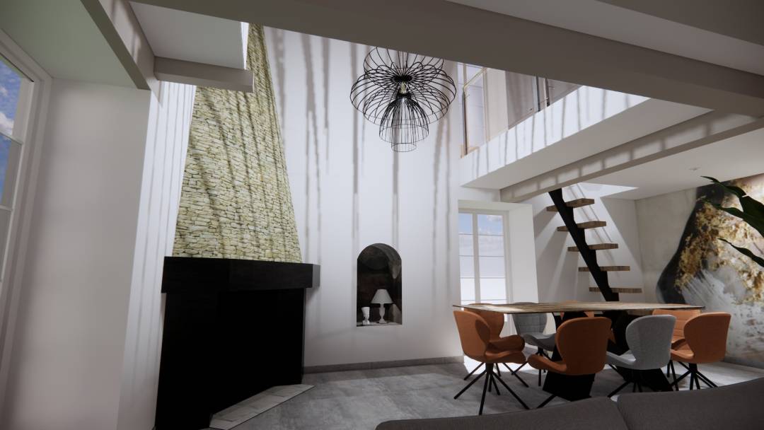 Réaménagement complet de l'entrée, du salon, de la salle à manger et de la mezzanine dans un style contemporain et minimaliste. Mes clients ont exprimé le désir d'adopter un univers radicalement différent. Ils souhaitaient passer d'une ambiance rustique marquée par des poutres apparentes, du crépi sur les murs, du mobilier ancien en bois et de nombreux objets décoratifs en fer forgé, à un style contemporain et épuré. Ils voulaient également illuminer l'espace sans ajouter de nouvelles ouvertures tout en préservant le caractère authentique de la maison. Une magnifique cheminée avec un conduit en pierre sèche, atteignant une hauteur sous plafond de 7 mètres, a été repensée et nettoyée pour conserver cette impressionnante verticalité. J'ai proposé à mes clients un service clé en main, répondant à leur besoin crucial de visualisation et d'assistance dans le choix des revêtements, des couleurs et du mobilier.