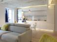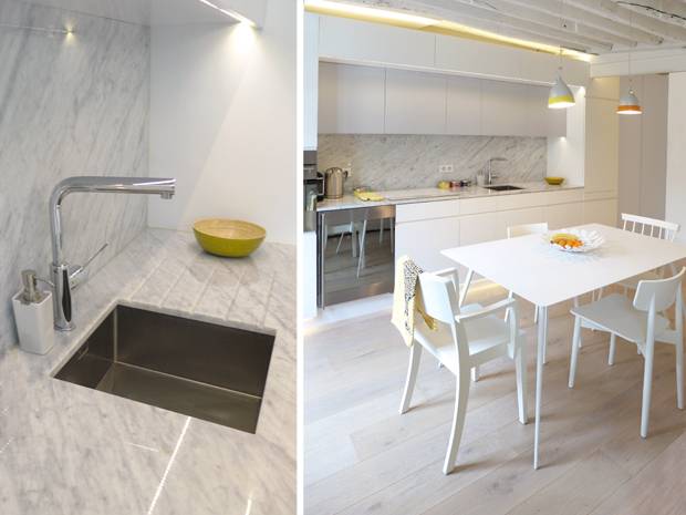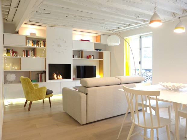 Dans cet appartement de charme, la surface a été optimisée pour libérer un maximum d’espace dans le séjour. Les cloisons ont été redistribuées et ont permis une entrée en continuité avec l’espace de vie. Le sol existant en tomette a été recouvert d’un parquet chêne blanchi et le plafond en poutres apparentes a été peint en blanc. Le mur de l’ancienne cheminée (inexploitable) fait place à une bibliothèque sur mesure avec un foyer bio-éthanol. A l’opposé, la cuisine a été réalisée sur mesure avec un plan de travail en marbre de carrare. Dans la salle de bain et l’entrée, une bande jaune apporte une touche de couleur en harmonie avec le mobilier et les textiles choisis.