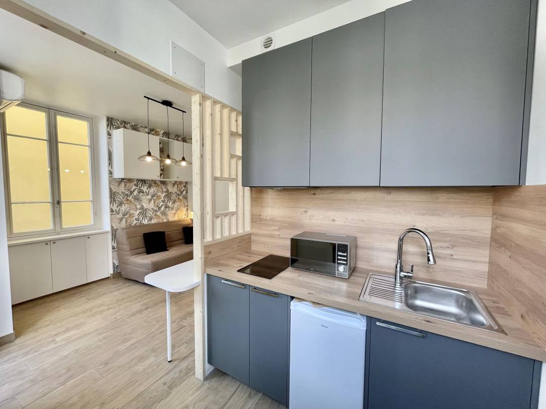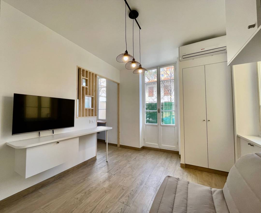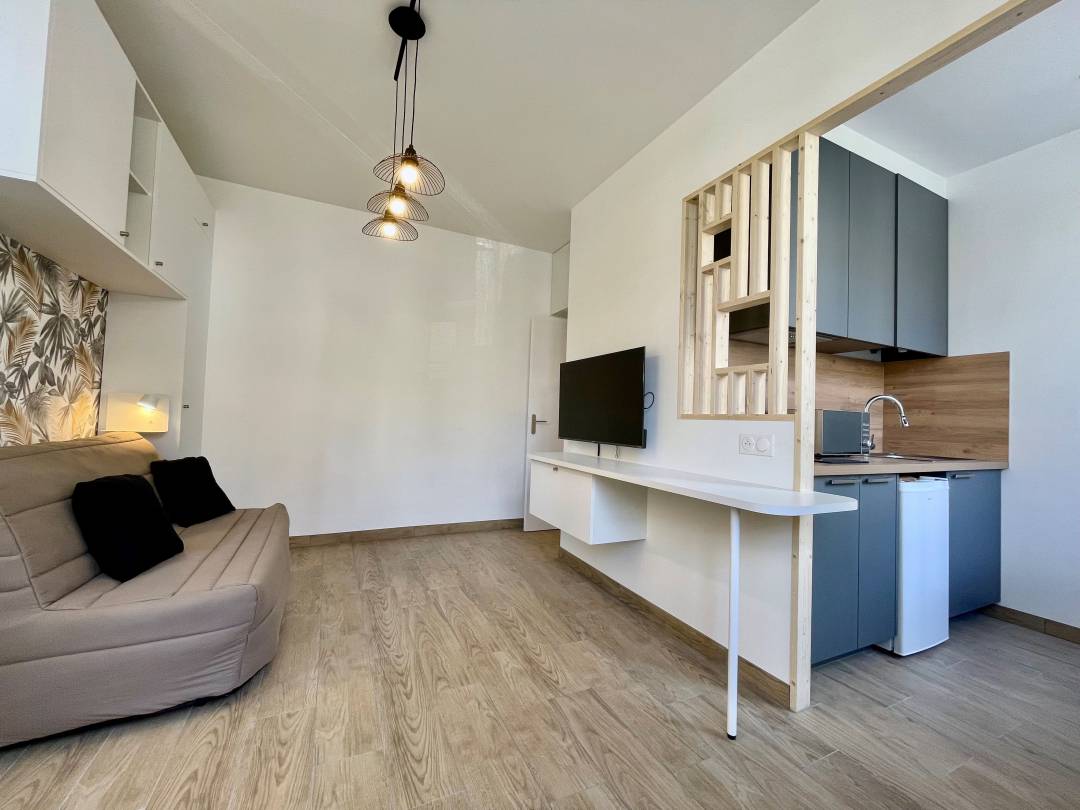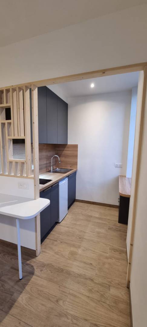 Ce projet a été réalisé pour un client investisseur immobilier. De la conception au suivi de chantier à l'installation du mobilier, j'ai accompagné mon client de A à Z sur la rénovation totale de ce studio. Pour optimiser l'espace et créer un maximum de rangements, j'ai proposé des meubles sur mesure pouvant être conçus avec des caissons Leroy merlin afin de respecter le budget fixé par mon client. Une attention particulière a été apportée à la décoration afin de se démarquer des autres logements proposés à la location longue durée.