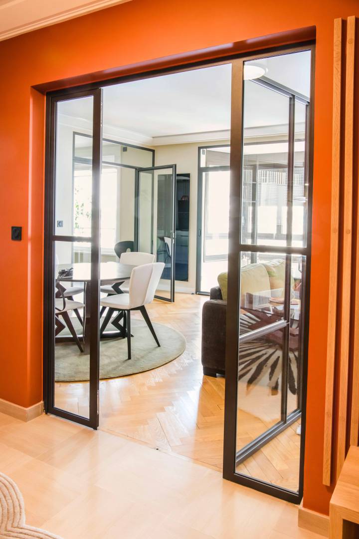 Pour ce projet, mes clients qui vivaient dans leur appartement depuis 20 ans souhaitaient tout changer ou presque !  L'organisation générale de l'appartement a été conservée mais des portes-verrières dessinées par mes soins ont été posées faisant ainsi circuler plus généreusement la lumière du jour. Des agencements conçus sur mesure permettent de répondre parfaitement aux besoins de rangement exprimés par mes clients. Le placard d'entrée a été retravaillé, ses façades mixent une belle teinte d'orange brûlé et chêne clair. Un agencement laqué coloris thé fumé et dessiné sur mesure avec des façades en placage noyer constitue la pièce maîtresse du salon. À l'opposé, un grand tableau d'Agnès Conod, Le Monde est beau, lui fait face. Une nouvelle cuisine, plus fonctionnelle et disposant de nombreux rangements, a été installée. Les façades blanches et le plan de travail en pierre noire sont mis en valeur par les murs kaki clair. La nouvelle porte en plaquage chêne avec une partie rainurée permet d'atteindre la partie nuit de l'appartement. Les chambres ont été personnalisées selon leurs occupants: fraîcheur printanière dans la chambre principale, boudoir masculin dans le bureau de Monsieur et ambiance ensoleillée dans la chambre d'amis.