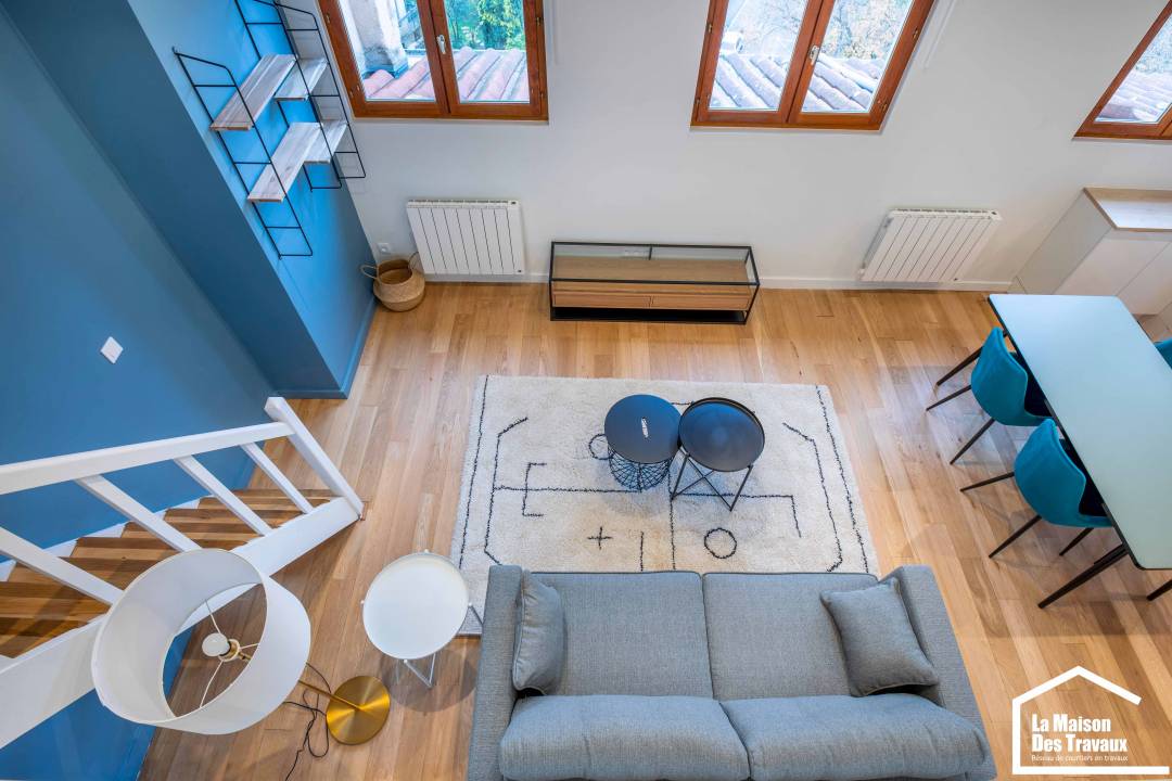 Cet appartement a été rénové entièrement dans le but de louer meublé à des étudiants ou en location courte durée. Pour créer un appartement plus contemporain et pouvant être occupé par 1 ou 2 personnes, la cuisine a été repensée, décloisonnée et se prolonge désormais sur l’espace de vie. Dans cet appartement qui ne possédait que des espaces ouverts, nous avons créé, tout en préservant un salon-séjour confortable, une chambre qui bénéficie de la lumière en second jour grâce à une verrière. Un second espace nuit avec bureau a été installé sur la mezzanine. La salle de bain a été totalement rénovée et bien que de petites dimensions, elle est très fonctionnelle et tout à fait charmante avec son mur en pierres et ses zelliges bleus. Rénové, décoré et meublé, cet appartement est désormais prêt à accueillir ses nouveaux occupants !