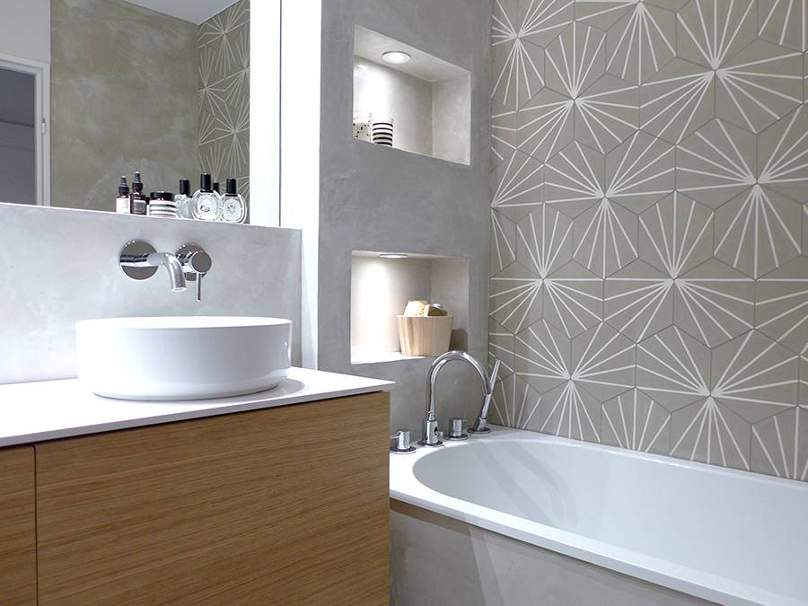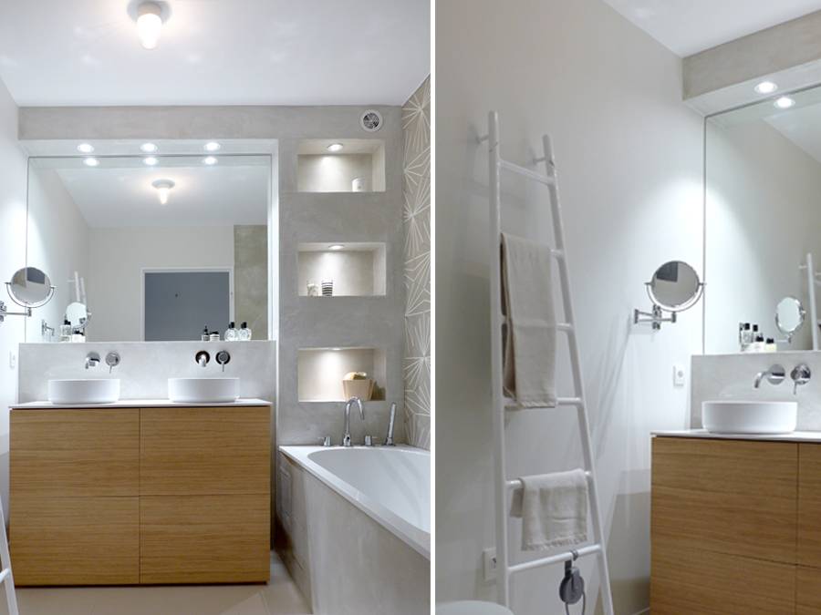 Dans le séjour, les meubles sur mesure ont été réalisé en laque satinée blanche et placage chêne. Dans les salles d’eau, les meubles sur mesure sont réalisé en placage chêne et plan de travail en pierre blanche reconstituée. les murs de la salle de bain sont en béton ciré et carreaux de ciment. Nous avons accordé une attention particulière à l’éclairage : faux plafond avec spots, corniche lumineuse, appliques, bandeaux leds.