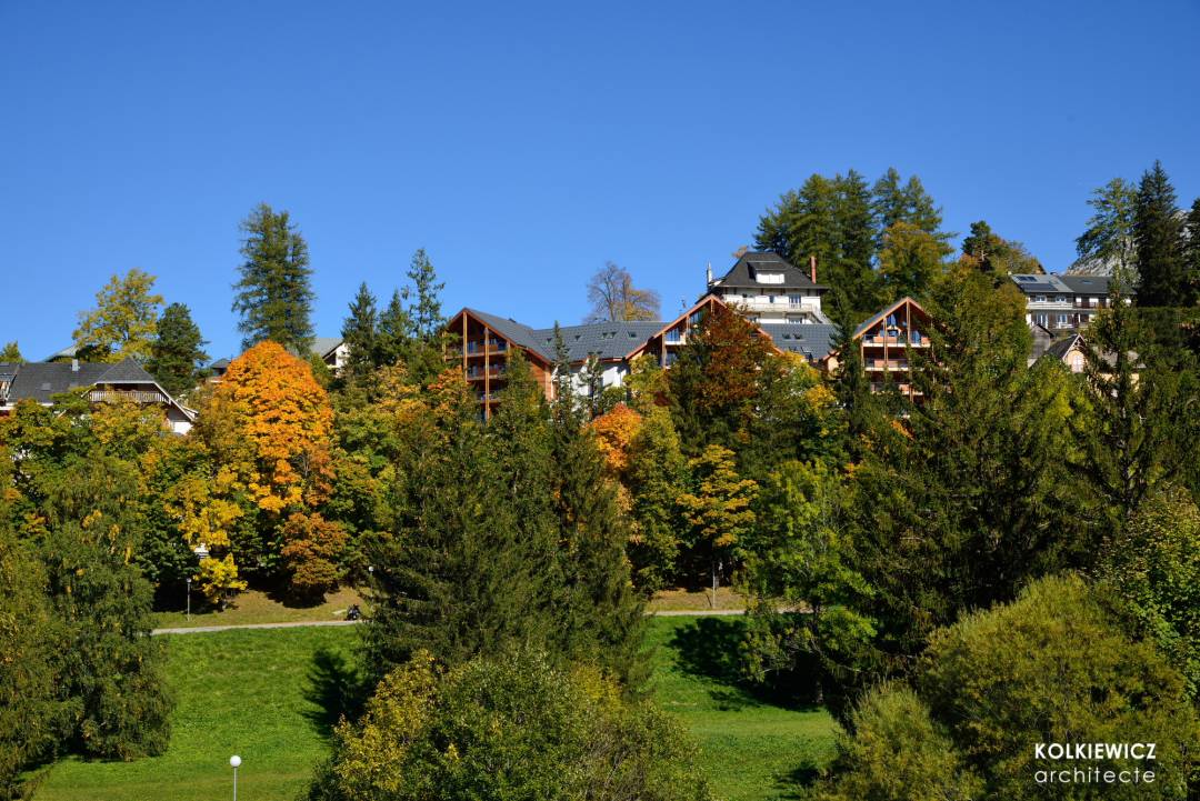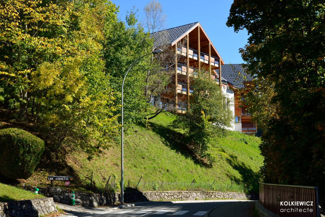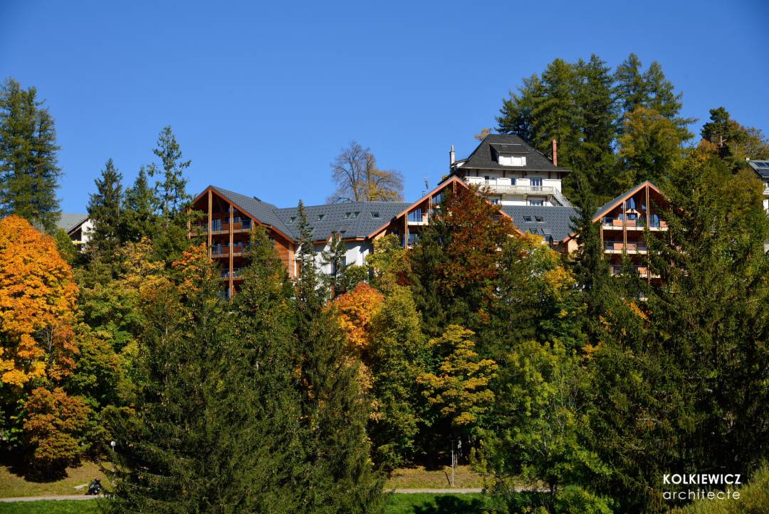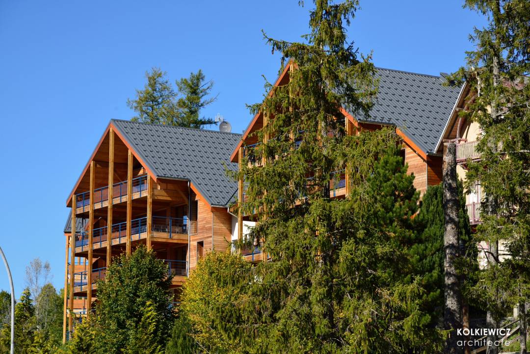 Construction de 25 logements collectifs de grand standing répartis sur 3 bâtiments de type gros chalet sur 4 niveaux et s'intégrant parfaitement dans le site naturel et l'architecture montagnarde de la station de Villard-de-Lans. Construction conforme aux normes environnementales BBC (Bâtiment Basse Consommation). Maître d'ouvrage: Albaret et Guéripel