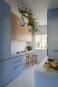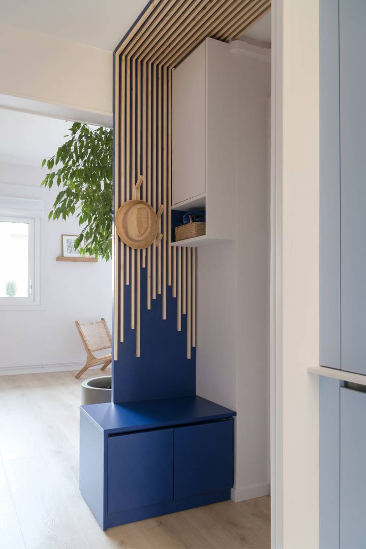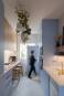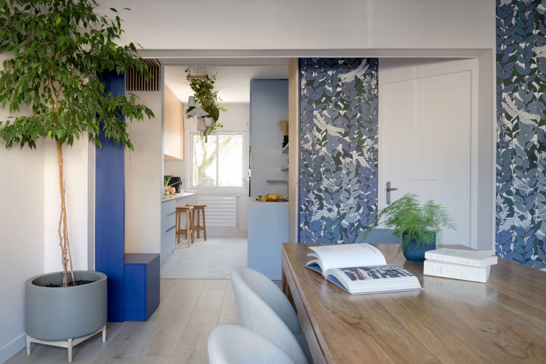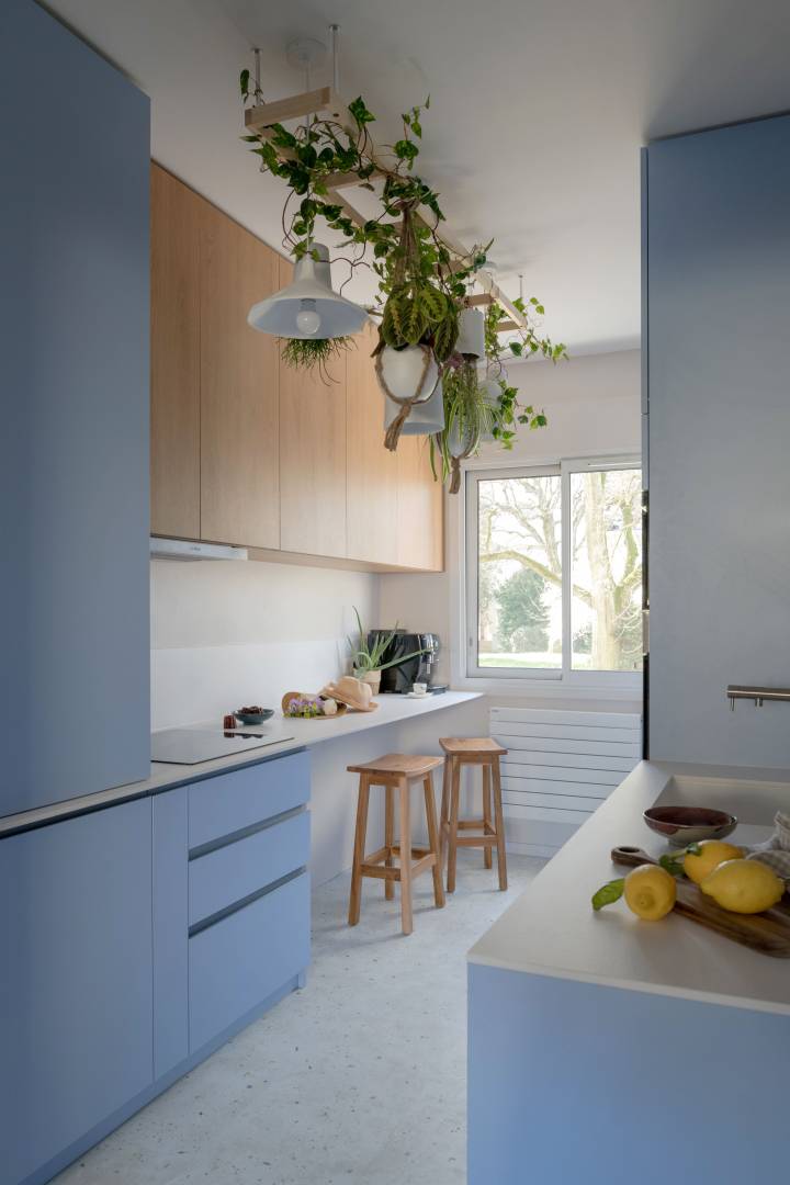 Le projet a permis de rénover la cuisine, de créer des rangements sur mesure, de matéraliser l'espace d'entrée, et de rénover la pièce de vie. L'accès à l'espace technique est masqué grace à une porte dérobée intégrée à la cuisine sur mesure réalisée par un ébéniste. La mise en place de végétation au plafond de la cuisine est rendue possible grace aux habitudes des clients et pour répondre à leurs goûts.