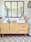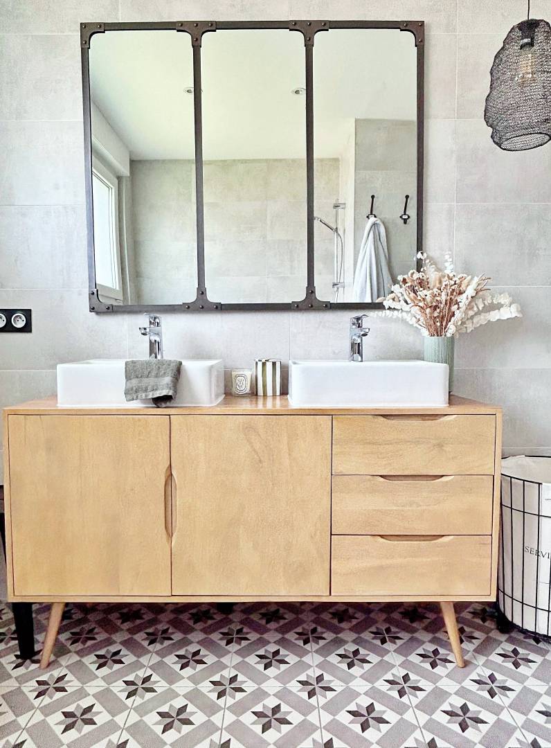 Rénovation complète d'une salle de bain mélangeant le style rétro et industriel avec une enfilade vintage et des carreaux de ciment au sol